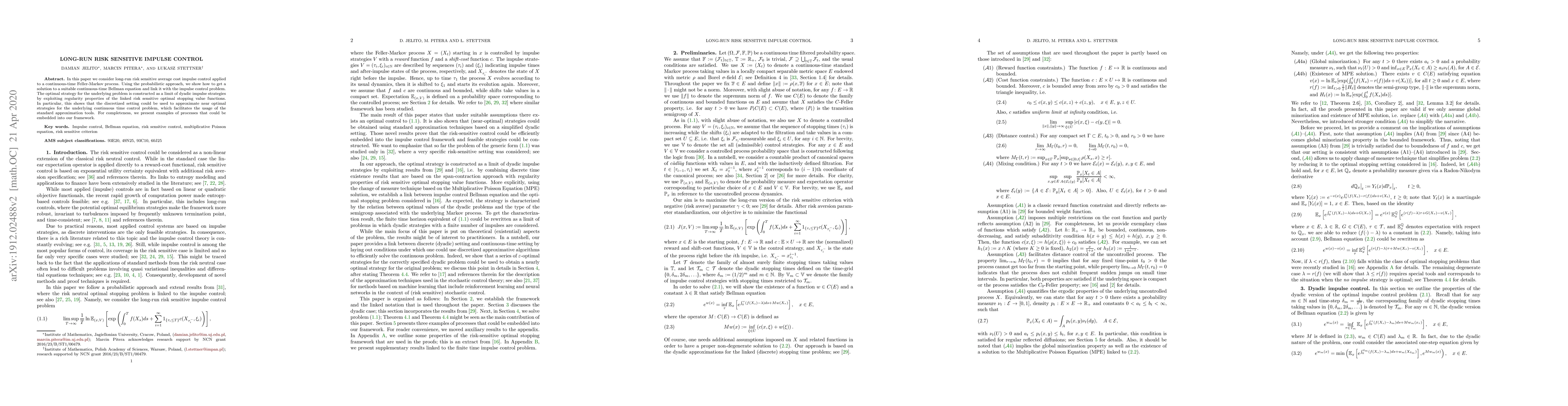 This paper develops a long-run risk sensitive impulse control strategy for continuous-time Feller-Markov processes, solving a continuous-time Bellman equation and constructing an optimal strategy as a limit of dyadic impulse strategies. It demonstrates that discretized settings can approximate near-optimal strategies for the continuous-time problem.