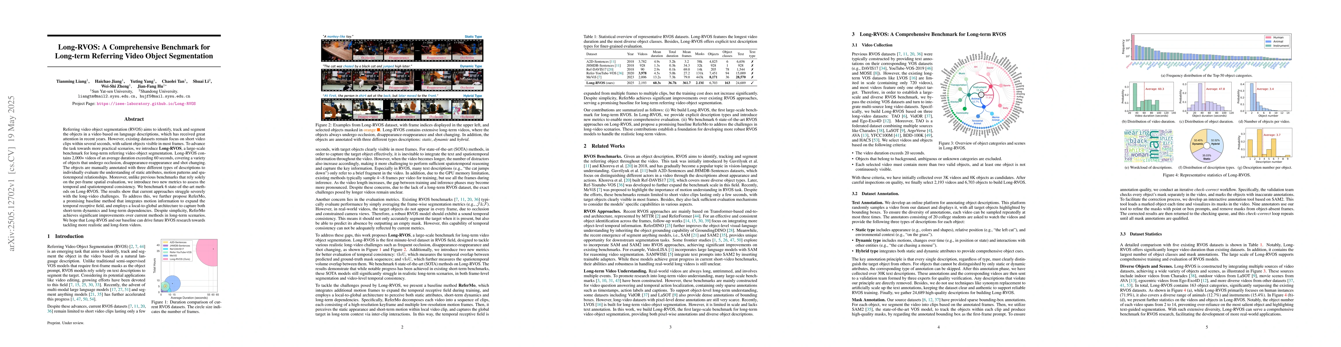 A new benchmark for long-term referring video object segmentation (RVOS) has been introduced, with over 2,000 videos and a variety of challenging scenarios, showing current methods struggle with long-video tasks.