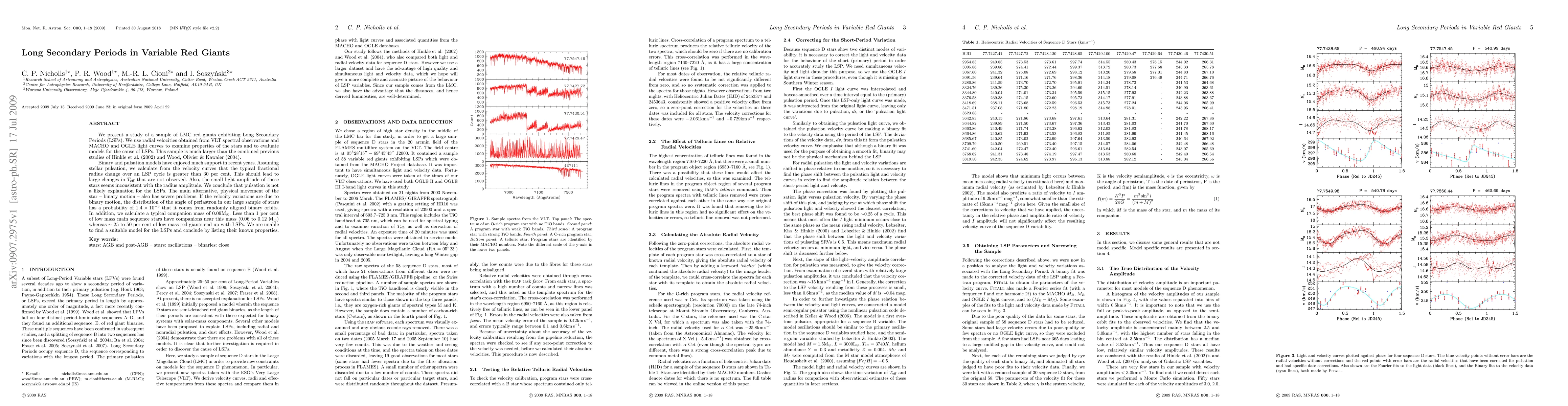 A study of red giant stars in the Large Magellanic Cloud found that pulsation models do not explain their Long Secondary Periods (LSPs), which may instead be caused by physical movement or binary motion with unlikely companion masses.