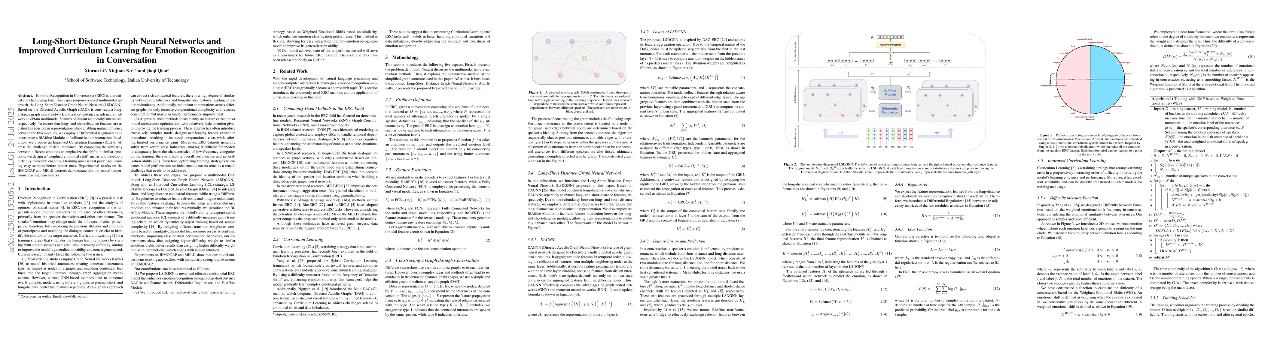 Emotion Recognition in Conversation (ERC) is a practical and challenging task. This paper proposes a novel multimodal approach, the Long-Short Distance Graph Neural Network (LSDGNN). Based on the Directed Acyclic Graph (DAG), it constructs a long-distance graph neural network and a short-distance graph neural network to obtain multimodal features of distant and nearby utterances, respectively. To ensure that long- and short-distance features are as distinct as possible in representation while enabling mutual influence between the two modules, we employ a Differential Regularizer and incorporate a BiAffine Module to facilitate feature interaction. In addition, we propose an Improved Curriculum Learning (ICL) to address the challenge of data imbalance. By computing the similarity between different emotions to emphasize the shifts in similar emotions, we design a "weighted emotional shift" metric and develop a difficulty measurer, enabling a training process that prioritizes learning easy samples before harder ones. Experimental results on the IEMOCAP and MELD datasets demonstrate that our model outperforms existing benchmarks.