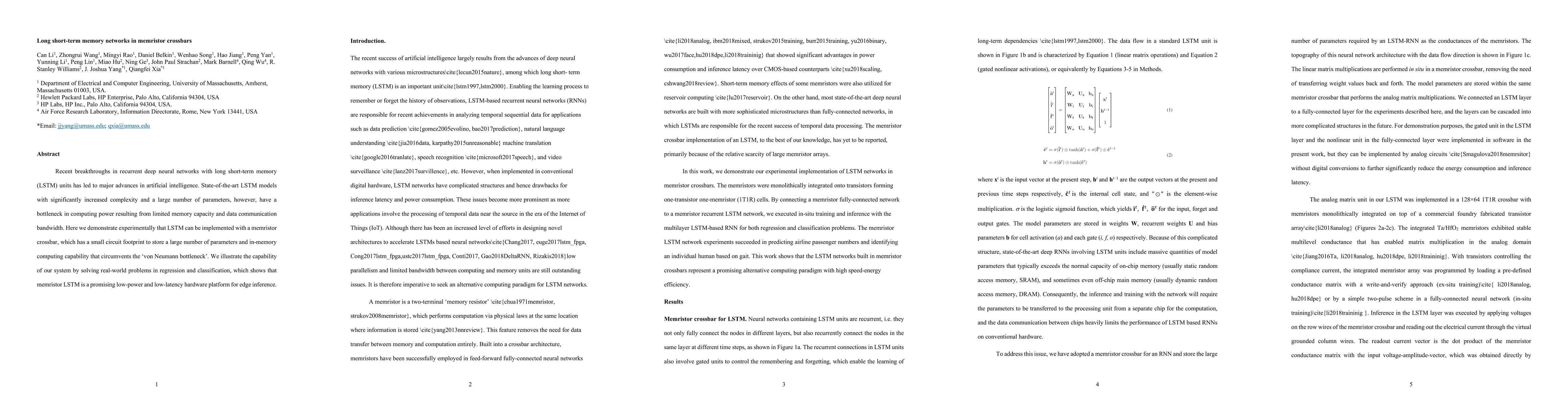 This paper demonstrates experimentally the implementation of long short-term memory (LSTM) networks using memristor crossbars, showcasing a low-power, low-latency solution that overcomes the traditional computing bottleneck by leveraging in-memory computing and a compact circuit design. The proposed system successfully solves real-world regression and classification problems, indicating its potential for edge inference applications.