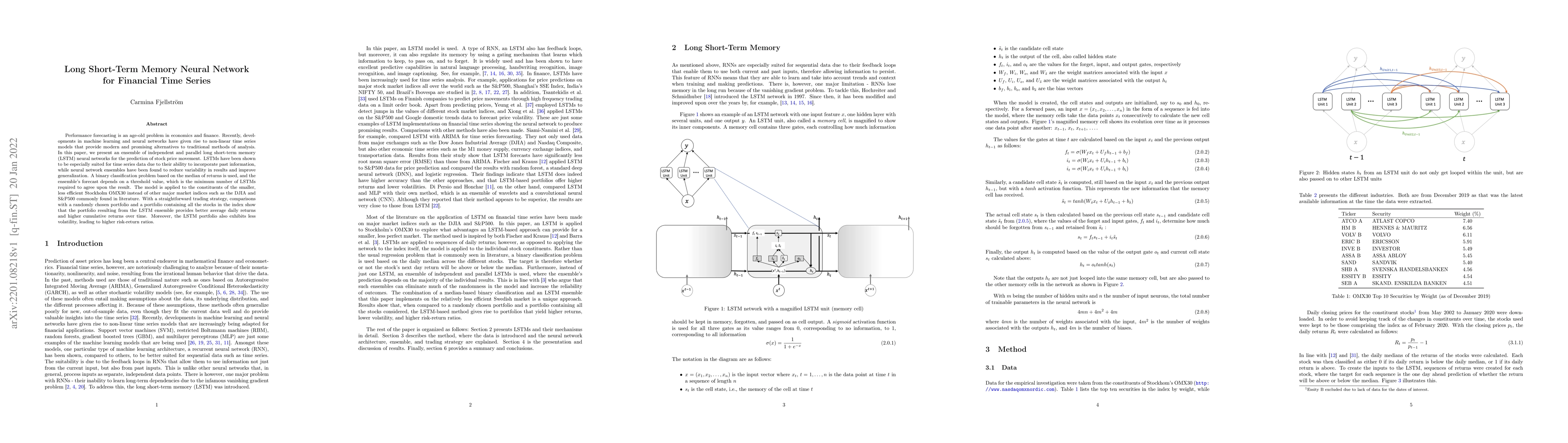 Performance forecasting is an age-old problem in economics and finance. Recently, developments in machine learning and neural networks have given rise to non-linear time series models that provide modern and promising alternatives to traditional methods of analysis. In this paper, we present an ensemble of independent and parallel long short-term memory (LSTM) neural networks for the prediction of stock price movement. LSTMs have been shown to be especially suited for time series data due to their ability to incorporate past information, while neural network ensembles have been found to reduce variability in results and improve generalization. A binary classification problem based on the median of returns is used, and the ensemble's forecast depends on a threshold value, which is the minimum number of LSTMs required to agree upon the result. The model is applied to the constituents of the smaller, less efficient Stockholm OMX30 instead of other major market indices such as the DJIA and S&P500 commonly found in literature. With a straightforward trading strategy, comparisons with a randomly chosen portfolio and a portfolio containing all the stocks in the index show that the portfolio resulting from the LSTM ensemble provides better average daily returns and higher cumulative returns over time. Moreover, the LSTM portfolio also exhibits less volatility, leading to higher risk-return ratios.