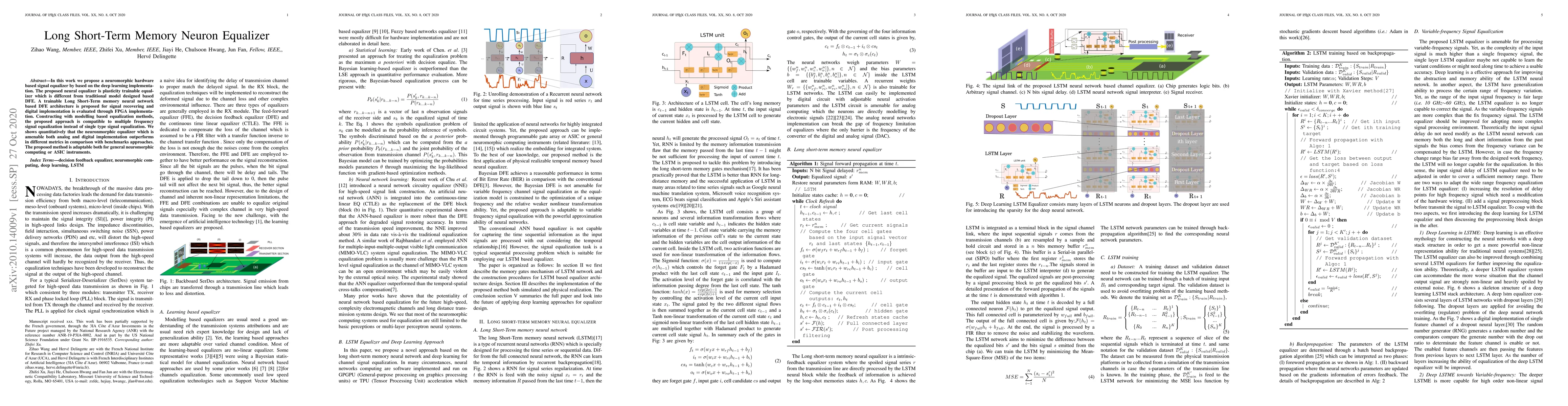 In this work we propose a neuromorphic hardware based signal equalizer by based on the deep learning implementation. The proposed neural equalizer is plasticity trainable equalizer which is different from traditional model designed based DFE. A trainable Long Short-Term memory neural network based DFE architecture is proposed for signal recovering and digital implementation is evaluated through FPGA implementation. Constructing with modelling based equalization methods, the proposed approach is compatible to multiple frequency signal equalization instead of single type signal equalization. We shows quantitatively that the neuronmorphic equalizer which is amenable both analog and digital implementation outperforms in different metrics in comparison with benchmarks approaches. The proposed method is adaptable both for general neuromorphic computing or ASIC instruments.