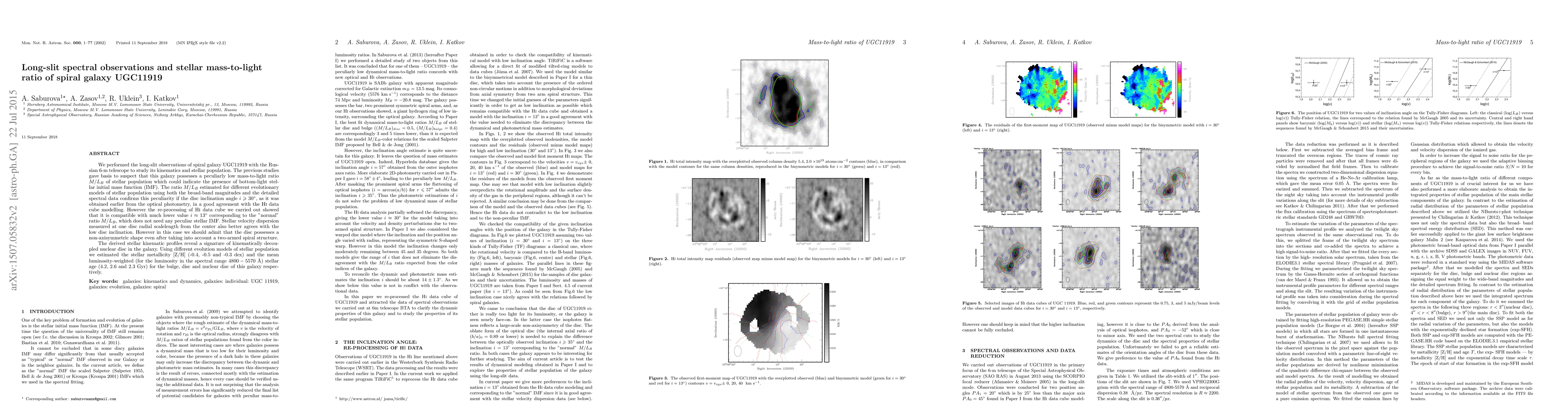 We performed the long-slit observations of spiral galaxy UGC11919 with the Russian 6-m telescope to study its kinematics and stellar population. The previous studies gave basis to suspect that this galaxy possesses a peculiarly low mass-to-light ratio $M/L_B$ of stellar population which could indicate the presence of bottom-light stellar initial mass function (IMF). The ratio $M/L_B$ estimated for different evolutionary models of stellar population using both the broad-band magnitudes and the detailed spectral data confirms this peculiarity if the disc inclination angle $i>30^o$, as it was obtained earlier from the optical photometry, in a good agreement with the HI data cube modelling. However the re-processing of HI data cube we carried out showed that it is compatible with much lower value $i=13^o$ corresponding to the "normal" ratio $M/L_B$, which does not need any peculiar stellar IMF. Stellar velocity dispersion measured at one disc radial scalelength from the center also better agrees with the low disc inclination. However in this case we should admit that the disc possesses a non-axisymmetric shape even after taking into account a two-armed spiral structure. The derived stellar kinematic profiles reveal a signature of kinematically decoupled nuclear disc in the galaxy. Using different evolution models of stellar population we estimated the stellar metallicity [Z/H] (-0.4, -0.5 and -0.3 dex) and the mean luminosity-weighted (for the luminosity in the spectral range $4800-5570$ \AA) stellar age (4.2, 2.6 and 2.3 Gyr) for the bulge, disc and nuclear disc of this galaxy respectively.