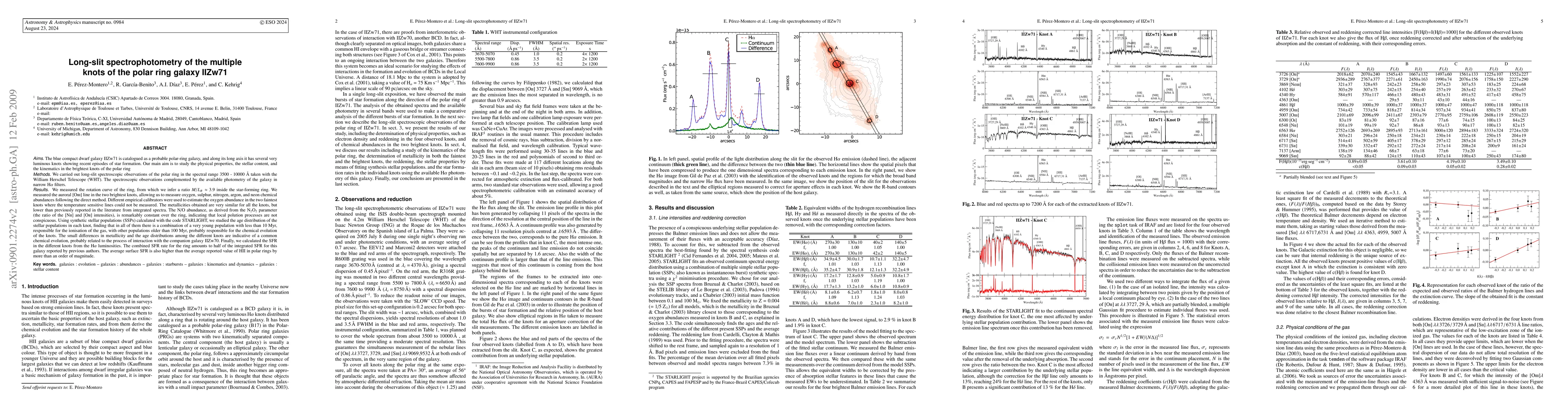 We carried out long-slit spectroscopic observations of the star forming knots along the polar ring of the dwarf galaxy IIZw71 in the spectral range 3500 - 10000 angstroms taken with the William erschel Telescope (WHT). The spectroscopic observations were complemented with available photometry of the galaxy in the narrow Halpha filter. We measured the rotation curve of the ring, from which we infer a ratio M/L_B = 3.9 inside the star forming ring. We measured the auroral [OIII] line in the two brightest knots, allowing us to measure oxygen, sulphur, nitrogen, argon and neon chemical abundances following the direct method. Different empirical calibrators were used to estimate the oxygen abundance in the two faintest knots. The metallicities obtained are very similar for all the knots, but lower than previously reported in the literature from integrated spectra. The N/O abundance, as derived from the N2O2 parameter, is remarkably constant over the ring, indicating that local polution processes are not conspicuous. Using synthetic stellar populations (SSPs) calculated with the code STARLIGHT, we studied the age distribution of the stellar populations in each knot, finding that in all of them there is a combination of a very young population with less than 10 Myr, responsible for the ionisation of the gas, with other populations older than 100 Myr, probably responsible for the chemical evolution of the knots. The small differences in metallicity and the age distributions among the different knots are indicative of a common chemical evolution, probably related to the process of interaction with the companion galaxy IIZw70.
