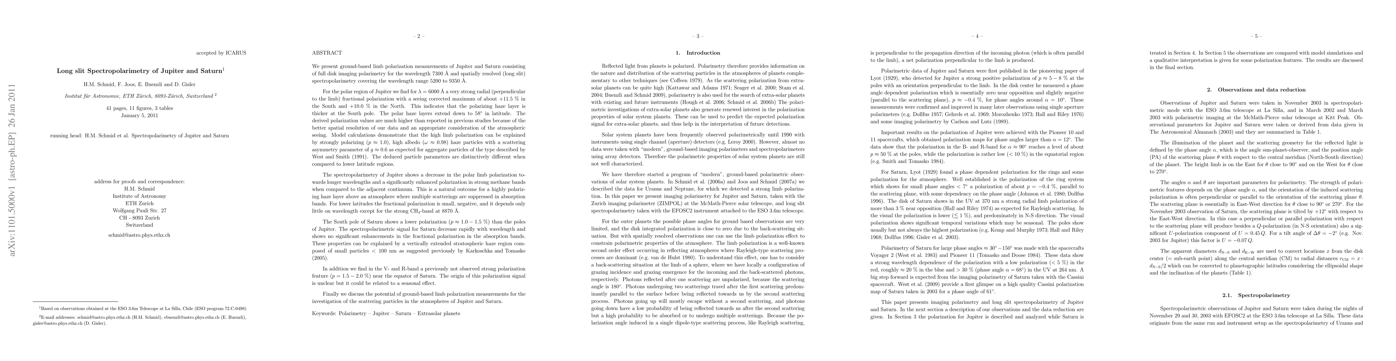 This study uses long slit spectropolarimetry to analyze limb polarization of Jupiter and Saturn, revealing significant differences in polar and equatorial regions. Jupiter's polar regions show strong radial polarization, attributed to high albedo haze particles, while Saturn's South pole exhibits lower polarization, suggesting a different particle composition.