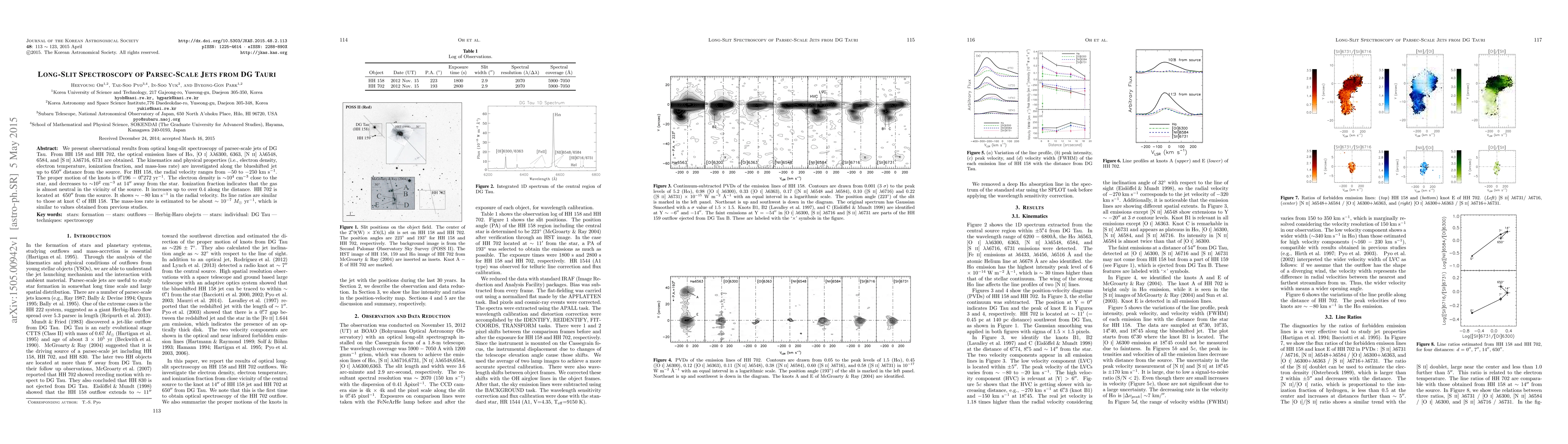 We present observational results from optical long-slit spectroscopy of parsec-scale jets of DG Tau. From HH 158 and HH 702, the optical emission lines of H_alpha, [O I] 6300, 6363, [N II] 6548, 6584, and [S II] 6716, 6731 are obtained. The kinematics and physical properties (i.e., electron density, electron temperature, ionization fraction, and mass-loss rate) are investigated along the blueshifted jet up to 650 arcseconds distance from the source. For HH 158, the radial velocity ranges from -50 to -250 km/s. The proper motion of the knots is 0.196 - 0.272 /yr. The electron density is ~ 10^{4}/cm^{3} close to the star, and decreases to ~ 10^{2} /cm^{3} at 14 arcseconds away from the star. Ionization fraction indicates that the gas is almost neutral in the vicinity of the source. It increases up to over 0.4 along the distance. HH 702 is located at ~ 650 arcseconds from the source. It shows ~ -80 km/s in the radial velocity. Its line ratios are similar to those at knot C of HH 158. The mass-loss rate is estimated to be about ~ 10^{-7} M_{sun}/yr, which is similar to values obtained from previous studies.