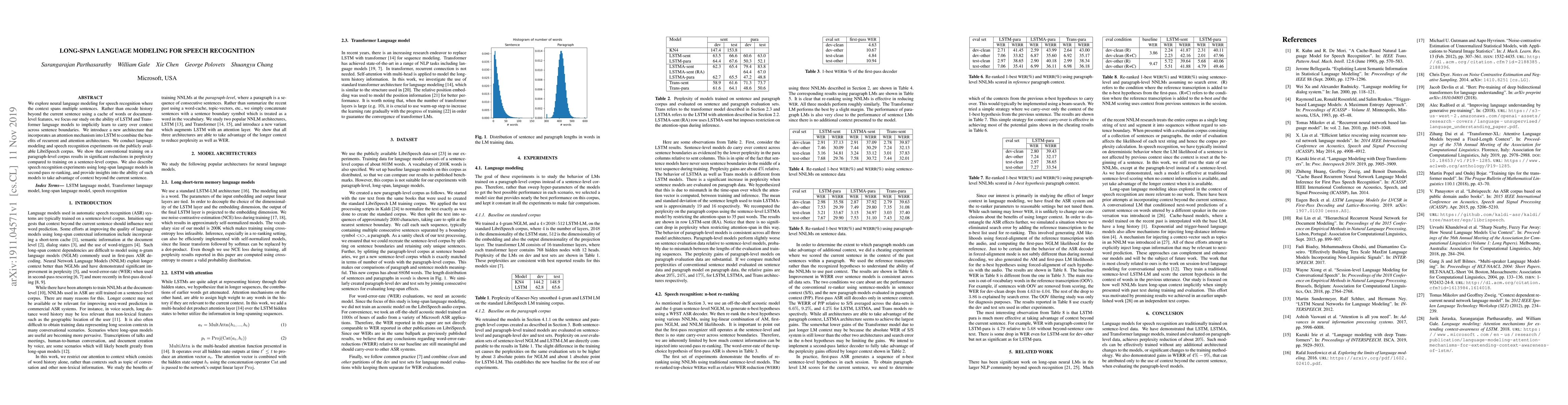 We explore neural language modeling for speech recognition where the context spans multiple sentences. Rather than encode history beyond the current sentence using a cache of words or document-level features, we focus our study on the ability of LSTM and Transformer language models to implicitly learn to carry over context across sentence boundaries. We introduce a new architecture that incorporates an attention mechanism into LSTM to combine the benefits of recurrent and attention architectures. We conduct language modeling and speech recognition experiments on the publicly available LibriSpeech corpus. We show that conventional training on a paragraph-level corpus results in significant reductions in perplexity compared to training on a sentence-level corpus. We also describe speech recognition experiments using long-span language models in second-pass re-ranking, and provide insights into the ability of such models to take advantage of context beyond the current sentence.
