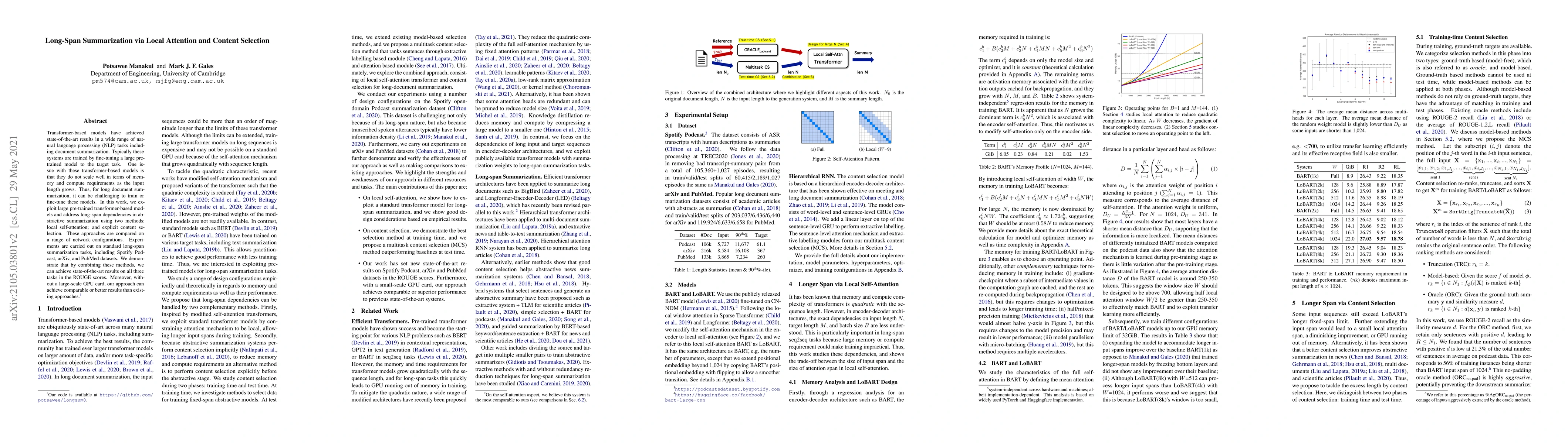 This paper proposes methods for long-span summarization using local attention and content selection to improve scalability of transformer-based models. Combining these techniques achieves state-of-the-art ROUGE scores on Spotify Podcast, arXiv, and PubMed datasets, demonstrating effectiveness even without large-scale GPU resources.