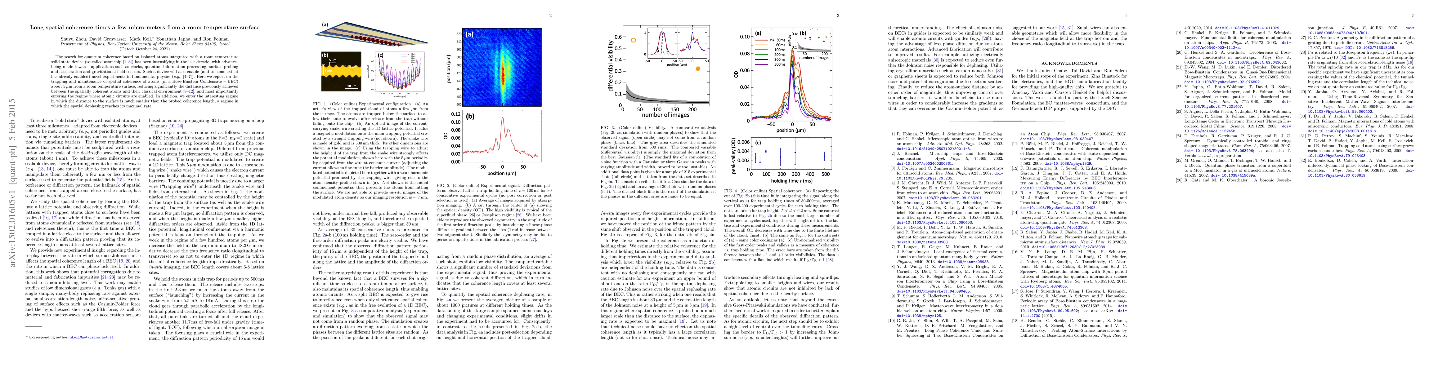 The search for quantum coherence based on isolated atoms integrated with a room temperature solid state device (so-called atomchip [1-3]) has been intensifying in the last decade, with advances being made towards applications such as clocks, quantum information processing, surface probing and acceleration and gravitational field sensors. Such a device will also enable (and to some extent has already enabled) novel experiments in fundamental physics (e.g., [4-7]). Here we report on the trapping and maintenance of spatial coherence of atoms (in a Bose-Einstein Condensate -- BEC) about 5$\mu$m from a room temperature surface, reducing significantly the distance previously achieved between the spatially coherent atoms and their classical environment [8-12], and most importantly entering the regime where atomic circuits are enabled. In addition, we enter the interesting regime in which the distance to the surface is much smaller than the probed coherence length, a regime in which the spatial dephasing reaches its maximal rate.