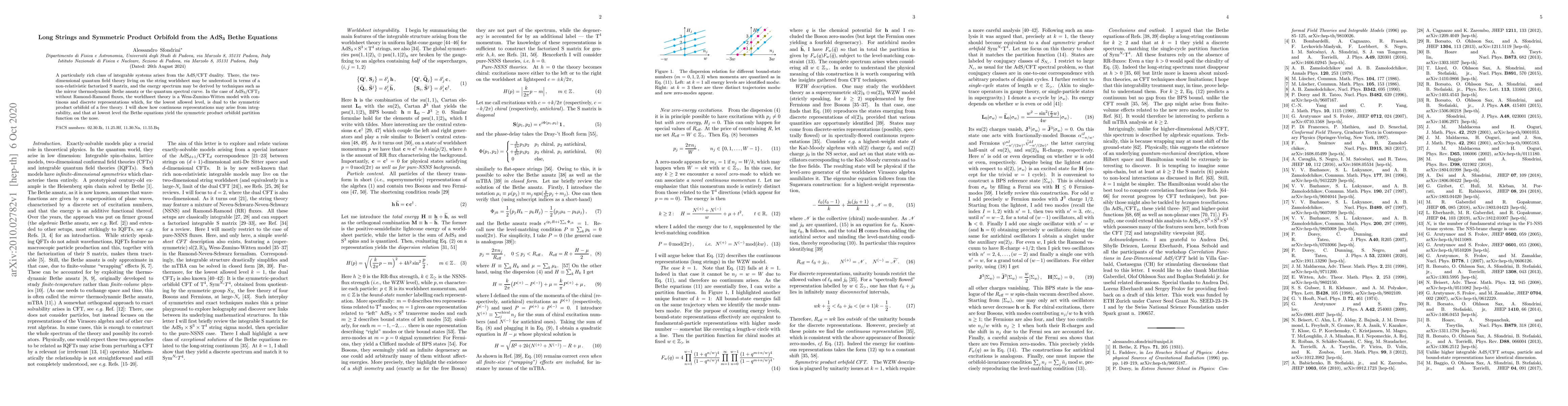 A particularly rich class of integrable systems arises from the AdS/CFT duality. There, the two-dimensional quantum field theory living on the string worldsheet may be understood in terms of a non-relativistic factorized S matrix, and the energy spectrum may be derived by techniques such as the mirror thermodynamic Bethe ansatz or the quantum spectral curve. In the case of AdS$_3$/CFT$_2$ without Ramond-Ramond fluxes, the worldhseet theory is a Wess-Zumino-Witten model with continous and discrete representations which, for the lowest allowed level, is dual to the symmetric product orbifold of a free theory. I will show how continuous representations may arise from integrability, and that at lowest level the Bethe equations yield the symmetric product orbifold partition function on the nose.