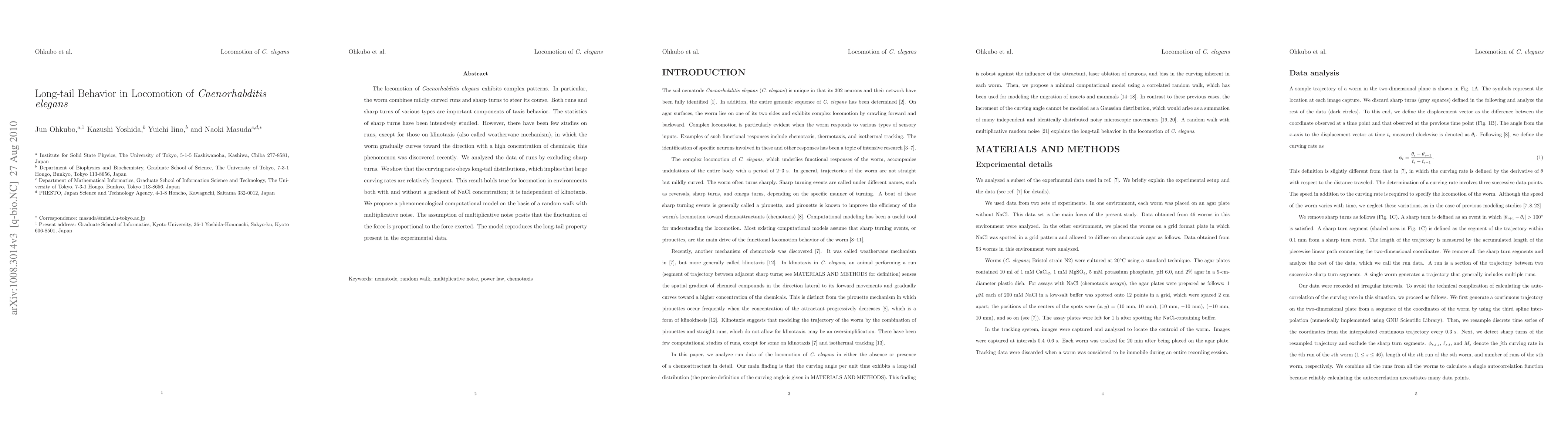 This study reveals that the curving rates of Caenorhabditis elegans runs follow long-tail distributions, indicating frequent large curving rates, independent of klinotaxis or NaCl concentration gradients. The researchers propose a computational model based on a random walk with multiplicative noise to replicate this behavior.