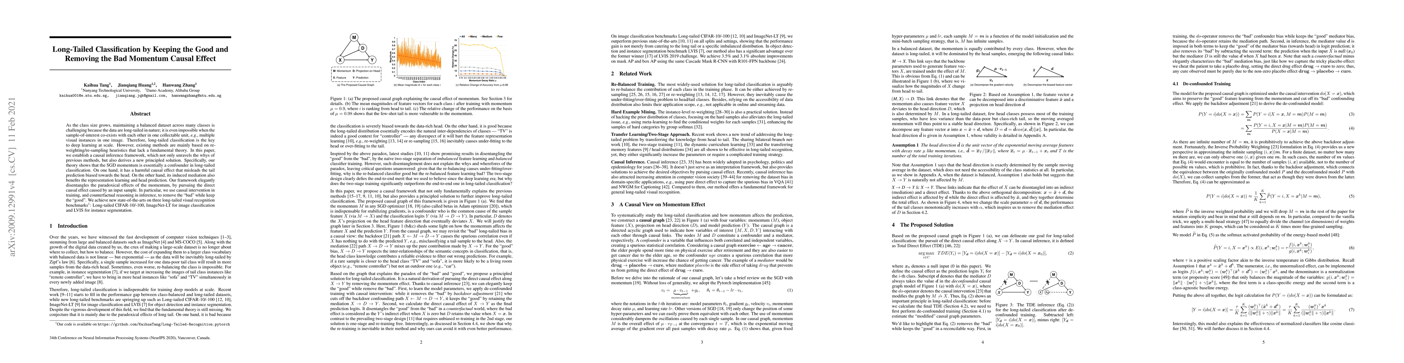 As the class size grows, maintaining a balanced dataset across many classes is challenging because the data are long-tailed in nature; it is even impossible when the sample-of-interest co-exists with each other in one collectable unit, e.g., multiple visual instances in one image. Therefore, long-tailed classification is the key to deep learning at scale. However, existing methods are mainly based on re-weighting/re-sampling heuristics that lack a fundamental theory. In this paper, we establish a causal inference framework, which not only unravels the whys of previous methods, but also derives a new principled solution. Specifically, our theory shows that the SGD momentum is essentially a confounder in long-tailed classification. On one hand, it has a harmful causal effect that misleads the tail prediction biased towards the head. On the other hand, its induced mediation also benefits the representation learning and head prediction. Our framework elegantly disentangles the paradoxical effects of the momentum, by pursuing the direct causal effect caused by an input sample. In particular, we use causal intervention in training, and counterfactual reasoning in inference, to remove the "bad" while keep the "good". We achieve new state-of-the-arts on three long-tailed visual recognition benchmarks: Long-tailed CIFAR-10/-100, ImageNet-LT for image classification and LVIS for instance segmentation.