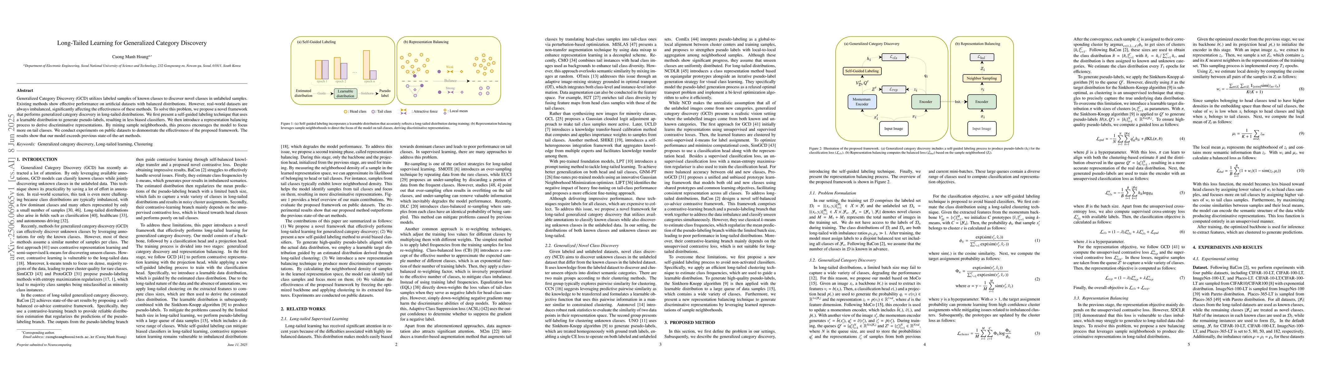 A new framework for generalized category discovery is proposed to handle long-tailed distributions in real-world datasets. It uses a self-guided labeling technique and representation balancing process to improve performance on tail classes.