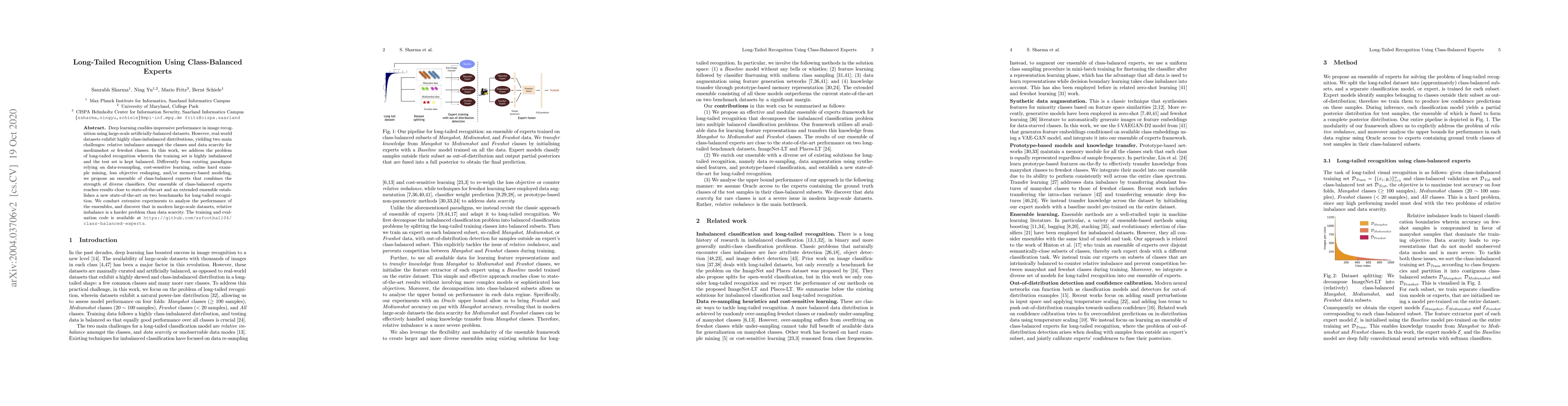 The paper proposes an ensemble of class-balanced experts for long-tailed recognition, tackling relative imbalance without complex models or sophisticated loss objectives. It decomposes the balanced classification problem into more manageable subproblems, training separate expert models for many-shot, medium-shot, and few-shot subsets with a reject class for samples outside an expert's class-balanced subset.