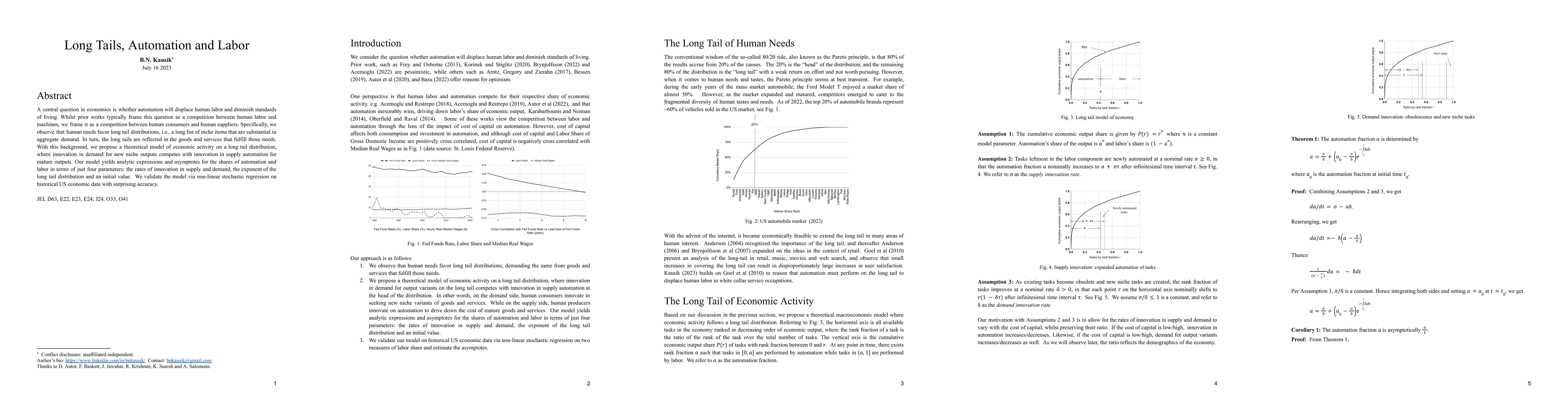 A central question in economics is whether automation will displace human labor and diminish standards of living. Whilst prior works typically frame this question as a competition between human labor and machines, we frame it as a competition between human consumers and human suppliers. Specifically, we observe that human needs favor long tail distributions, i.e., a long list of niche items that are substantial in aggregate demand. In turn, the long tails are reflected in the goods and services that fulfill those needs. With this background, we propose a theoretical model of economic activity on a long tail distribution, where innovation in demand for new niche outputs competes with innovation in supply automation for mature outputs. Our model yields analytic expressions and asymptotes for the shares of automation and labor in terms of just four parameters: the rates of innovation in supply and demand, the exponent of the long tail distribution and an initial value. We validate the model via non-linear stochastic regression on historical US economic data with surprising accuracy.