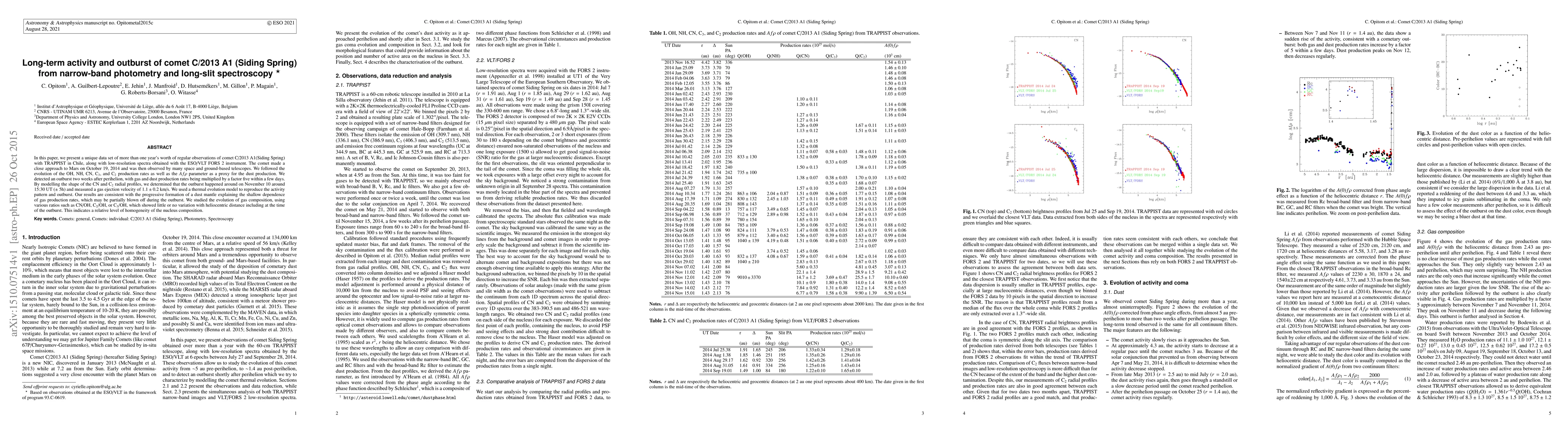 In this paper, we present a unique data set of more than one year's worth of regular observations of comet C/2013 A1(Siding Spring) with TRAPPIST in Chile, along with low-resolution spectra obtained with the ESO/VLT FORS 2 instrument. The comet made a close approach to Mars on October 19, 2014 and was then observed by many space and ground-based telescopes. We followed the evolution of the OH, NH, CN, $\mathrm{C_3}$, and $\mathrm{C_2}$ production rates as well as the $Af\rho$ parameter as a proxy for the dust production. We detected an outburst two weeks after perihelion, with gas and dust production rates being multiplied by a factor five within a few days. By modelling the shape of the CN and $\mathrm{C_2}$ radial profiles, we determined that the outburst happened around on November 10 around 15:30 UT ($\pm$ 5h) and measured a gas ejection velocity of $1.1\pm0.2$ km/s. We used a thermal evolution model to reproduce the activity pattern and outburst. Our results are consistent with the progressive formation of a dust mantle explaining the shallow dependence of gas production rates, which may be partially blown off during the outburst. We studied the evolution of gas composition, using various ratios such as CN/OH, $\mathrm{C_2}$/OH, or $\mathrm{C_3}$/OH, which showed little or no variation with heliocentric distance including at the time of the outburst. This indicates a relative level of homogeneity of the nucleus composition.