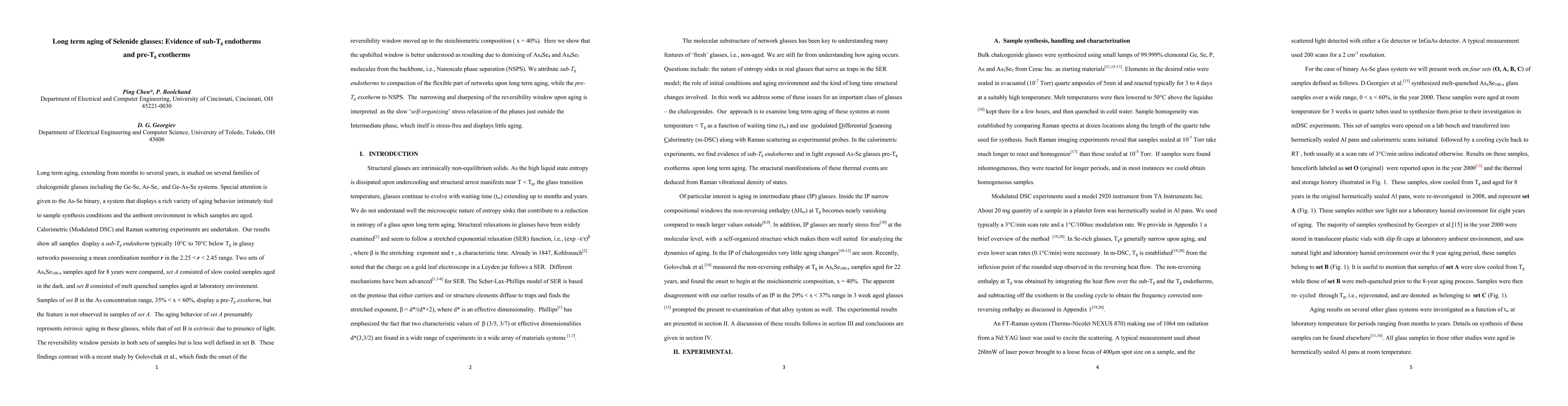 This study investigates the long-term aging behavior of various chalcogenide glasses, focusing on the As-Se system, and reveals that sub-Tg endotherms and pre-Tg exotherms are linked to intrinsic and extrinsic aging processes, respectively. The pre-Tg exotherm in samples exposed to light suggests nanoscale phase separation, while the sub-Tg endotherm indicates network compaction.