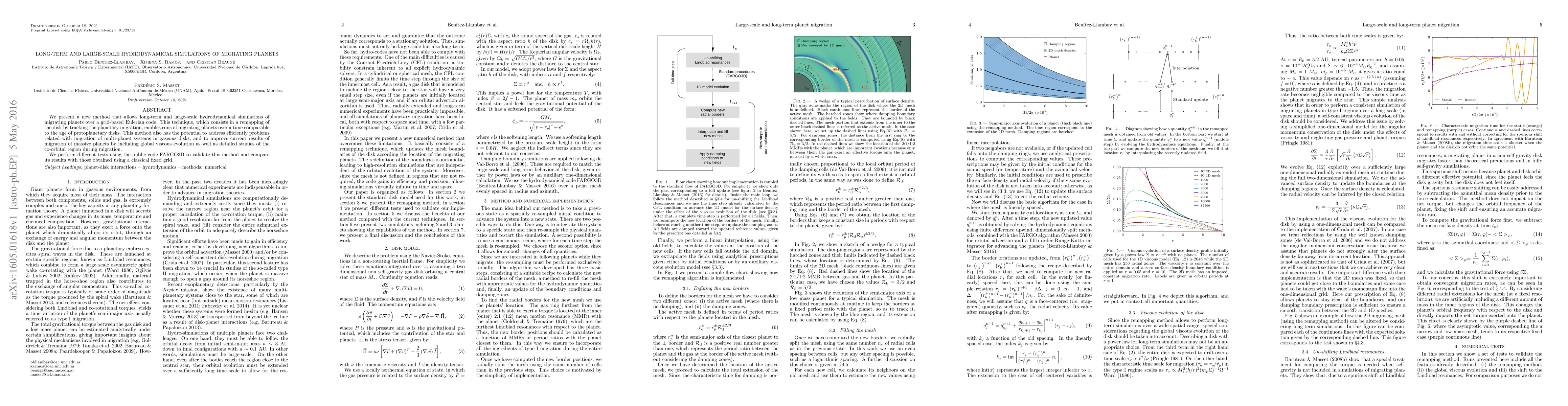 We present a new method that allows long-term and large-scale hydrodynamical simulations of migrating planets over a grid-based Eulerian code. This technique, which consists in a remapping of the disk by tracking the planetary migration, enables runs of migrating planets over a time comparable to the age of protoplanetary disks. This method also has the potential to address efficiently problems related with migration of multi-planet systems in gaseous disks, and to improve current results of migration of massive planets by including global viscous evolution as well as detailed studies of the co-orbital region during migration. We perform different tests using the public code FARGO3D to validate this method and compare its results with those obtained using a classical fixed grid.