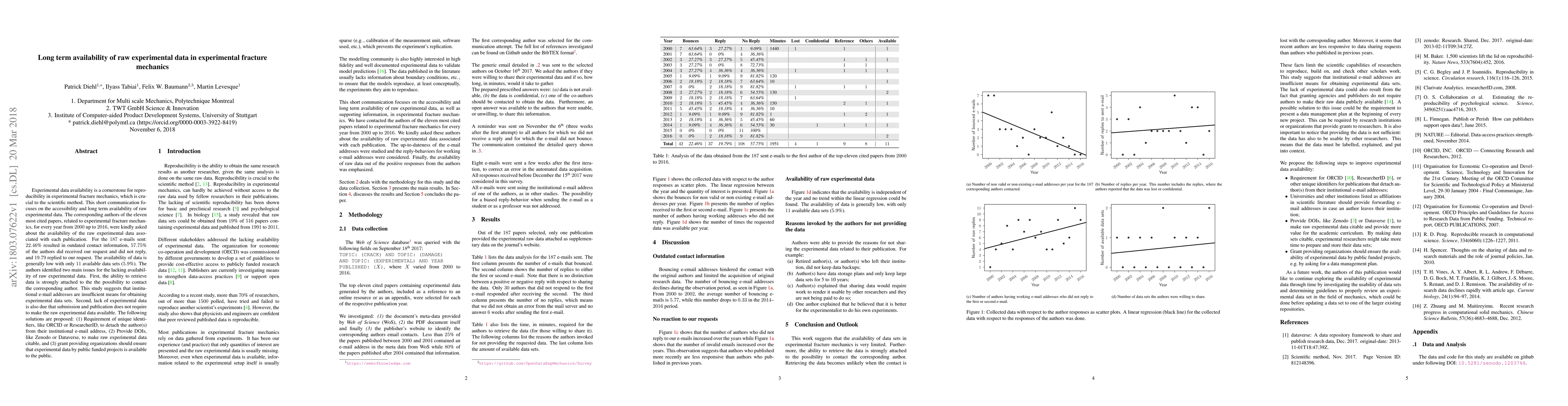 Experimental data availability is a cornerstone for reproducibility in experimental fracture mechanics, which is crucial to the scientific method. This short communication focuses on the accessibility and long term availability of raw experimental data. The corresponding authors of the eleven most cited papers, related to experimental fracture mechanics, for every year from 2000 up to 2016, were kindly asked about the availability of the raw experimental data associated with each publication. For the 187 e-mails sent: 22.46% resulted in outdated contact information, 57.75% of the authors did received our request and did not reply, and 19.79 replied to our request. The availability of data is generally low with only $11$ available data sets (5.9%). The authors identified two main issues for the lacking availability of raw experimental data. First, the ability to retrieve data is strongly attached to the the possibility to contact the corresponding author. This study suggests that institutional e-mail addresses are insufficient means for obtaining experimental data sets. Second, lack of experimental data is also due that submission and publication does not require to make the raw experimental data available. The following solutions are proposed: (1) Requirement of unique identifiers, like ORCID or ResearcherID, to detach the author(s) from their institutional e-mail address, (2) Provide DOIs, like Zenodo or Dataverse, to make raw experimental data citable, and (3) grant providing organizations should ensure that experimental data by public funded projects is available to the public.