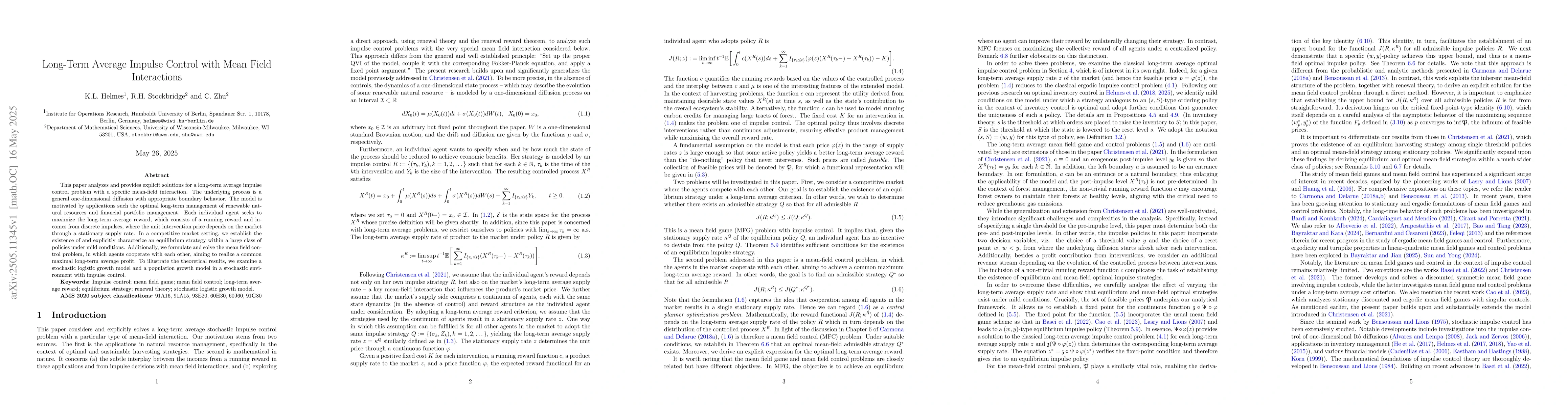 This work differs from existing research by explicitly characterizing equilibrium strategies in competitive markets with mean-field interactions and by extending mean-field game theory to long-term average impulse control problems.
