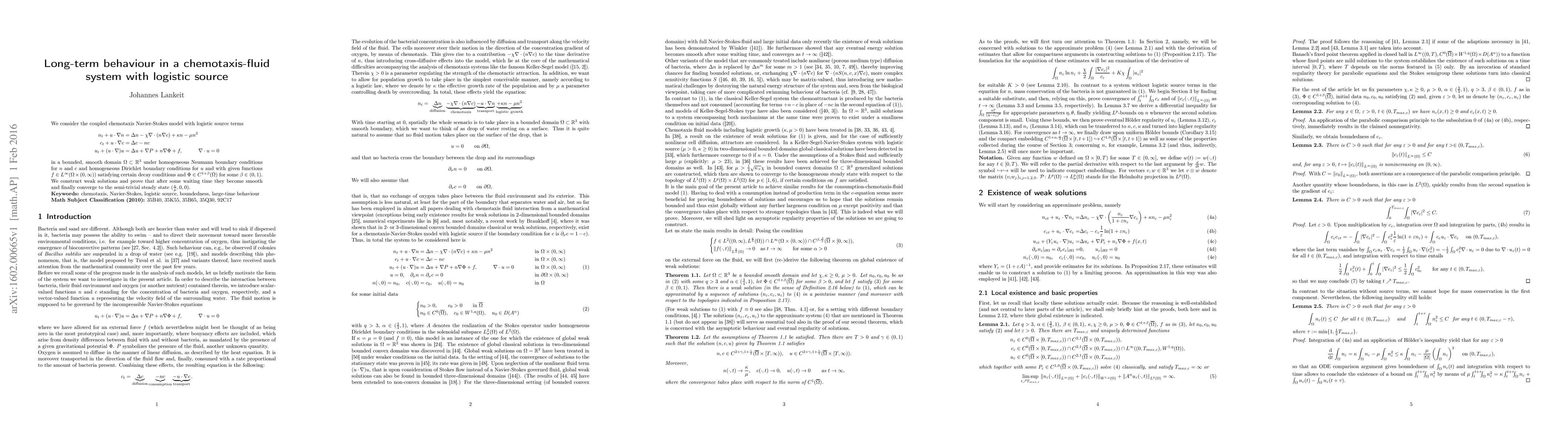 A study on a chemotaxis-fluid system with logistic source terms reveals that after a waiting time, solutions converge to the semi-trivial steady state, becoming smooth and stable.