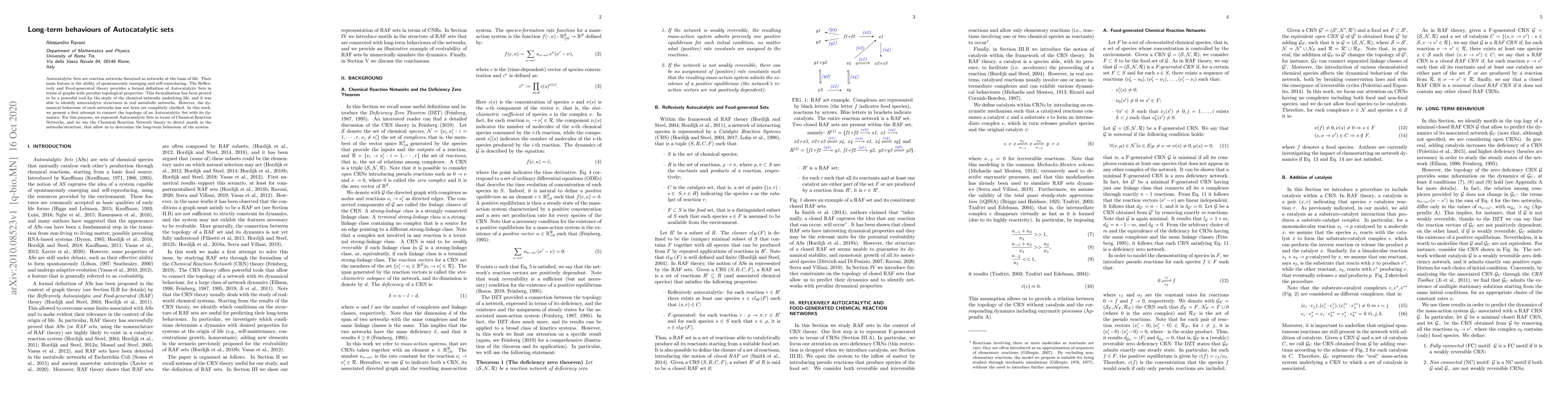 This paper investigates the long-term dynamical behaviours of Autocatalytic Sets, theorized as foundational networks in life, by connecting their topological properties with their chemical reaction dynamics. It employs Chemical Reaction Network theory to identify structural motifs and determine the system's long-term behaviour.