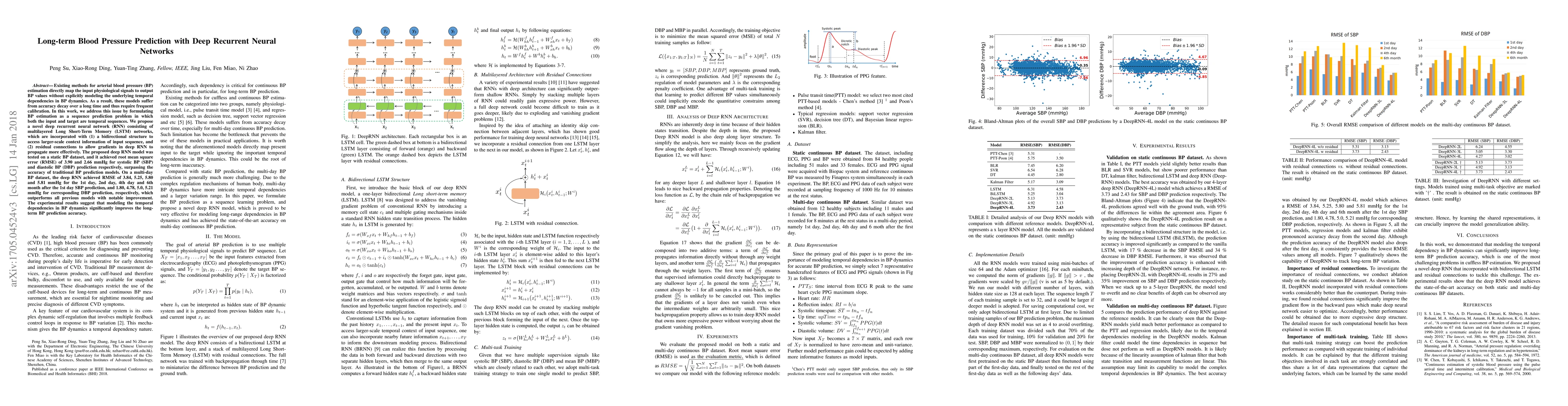 This paper proposes a deep recurrent neural network using multilayered LSTM networks with bidirectional structures and residual connections for long-term blood pressure prediction. The model significantly outperforms traditional methods by accurately capturing temporal dependencies, achieving lower RMSE values over days and months.