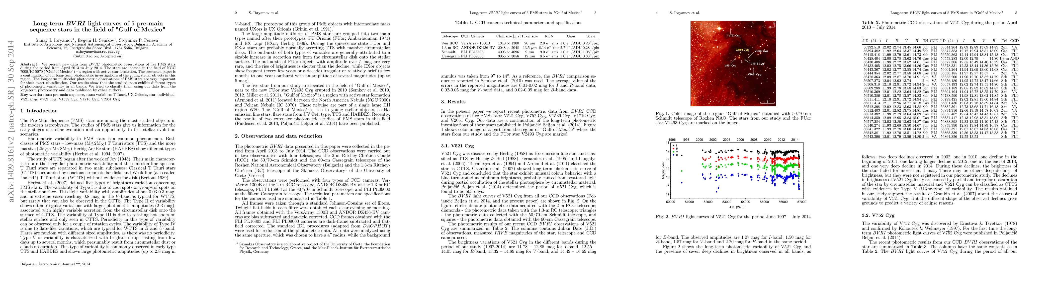We present new data from BVRI photometric observations of five PMS stars during the period from April 2013 to July 2014. The stars are located in the field of NGC 7000/IC 5070 ("Gulf of Mexico") - a region with active star formation. The presented paper is a continuation of our long-term photometric investigations of the young stellar objects in this region. The long-term multicolor photometric observations of PMS stars are very important for their exact classification. Our results show that the studied stars exhibit different types of photometric variability in all bands. We tried to classify them using our data from the long-term photometry and data published by other authors.