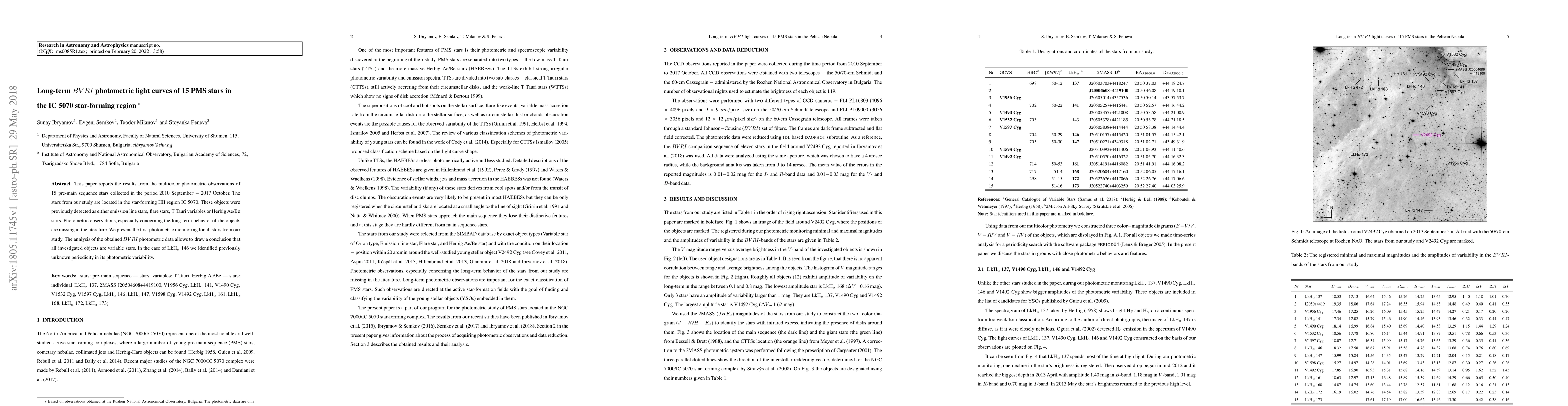 This paper reports the results from the multicolor photometric observations of 15 pre-main sequence stars collected in the period 2010 September - 2017 October. The stars from our study are located in the star-forming HII region IC 5070. These objects were previously detected as either emission line stars, flare stars, T Tauri variables or Herbig Ae/Be stars. Photometric observations, especially concerning the long-term behavior of the objects are missing in the literature. We present the first photometric monitoring for all stars from our study. The analysis of the obtained BVRI photometric data allows to draw a conclusion that all investigated objects are variable stars. In the case of LkHa 146 we identified previously unknown periodicity in its photometric variability.