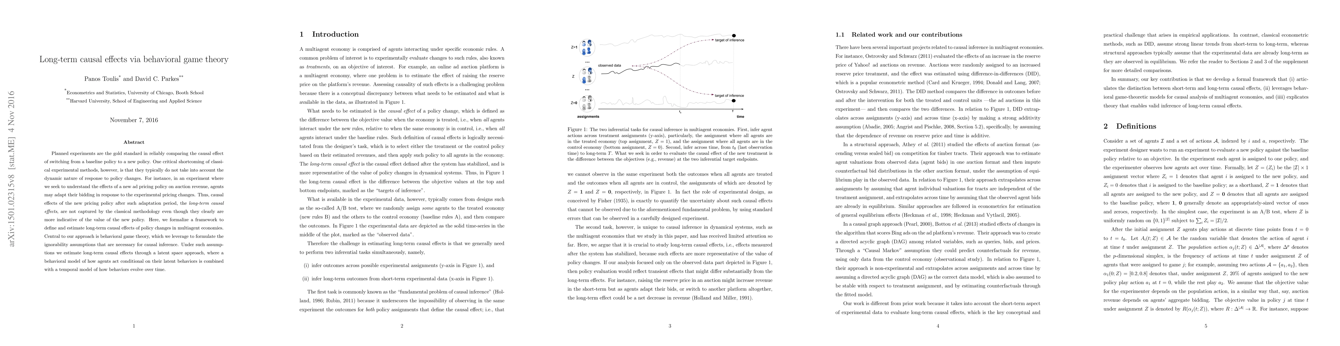 The paper presents a framework for estimating long-term causal effects of policy changes in multiagent economies using behavioral game theory. It formalizes ignorability assumptions for causal inference and estimates long-term causal effects through a latent space approach combining a behavioral model of agent actions with a temporal model of behavior evolution.