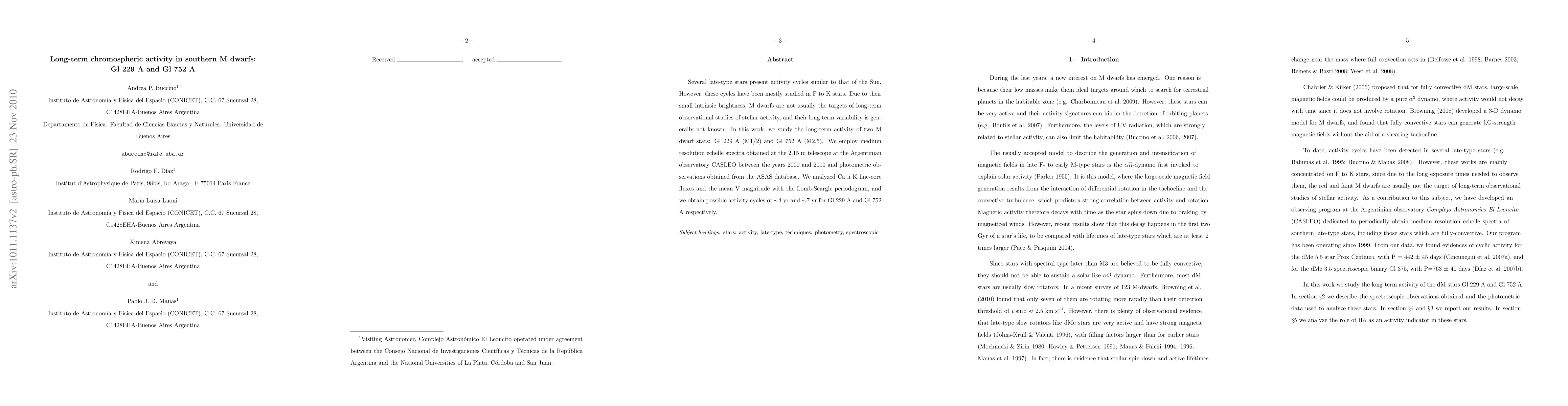 Several late-type stars present activity cycles similar to that of the Sun. However, these cycles have been mostly studied in F to K stars. Due to their small intrinsic brightness, M dwarfs are not usually the targets of long-term observational studies of stellar activity, and their long-term variability is generally not known. In this work, we study the long-term activity of two M dwarf stars: Gl 229 A (M1/2) and Gl 752 A (M2.5). We employ medium resolution echelle spectra obtained at the 2.15 m telescope at the Argentinian observatory CASLEO between the years 2000 and 2010 and photometric observations obtained from the ASAS database. We analyzed Ca \II K line-core fluxes and the mean V magnitude with the Lomb-Scargle periodogram, and we obtain possible activity cycles of $\sim$4 yr and $\sim$7 yr for Gl 229 A and Gl 752 A respectively.