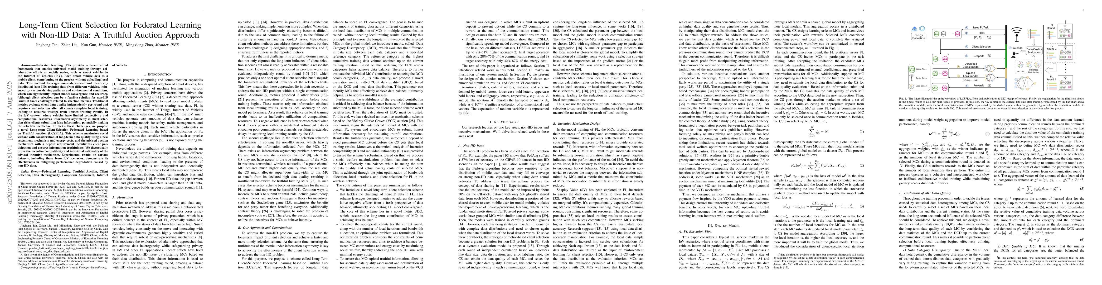 Federated learning (FL) provides a decentralized framework that enables universal model training through collaborative efforts on mobile nodes, such as smart vehicles in the Internet of Vehicles (IoV). Each smart vehicle acts as a mobile client, contributing to the process without uploading local data. This method leverages non-independent and identically distributed (non-IID) training data from different vehicles, influenced by various driving patterns and environmental conditions, which can significantly impact model convergence and accuracy. Although client selection can be a feasible solution for non-IID issues, it faces challenges related to selection metrics. Traditional metrics evaluate client data quality independently per round and require client selection after all clients complete local training, leading to resource wastage from unused training results. In the IoV context, where vehicles have limited connectivity and computational resources, information asymmetry in client selection risks clients submitting false information, potentially making the selection ineffective. To tackle these challenges, we propose a novel Long-term Client-Selection Federated Learning based on Truthful Auction (LCSFLA). This scheme maximizes social welfare with consideration of long-term data quality using a new assessment mechanism and energy costs, and the advised auction mechanism with a deposit requirement incentivizes client participation and ensures information truthfulness. We theoretically prove the incentive compatibility and individual rationality of the advised incentive mechanism. Experimental results on various datasets, including those from IoV scenarios, demonstrate its effectiveness in mitigating performance degradation caused by non-IID data.