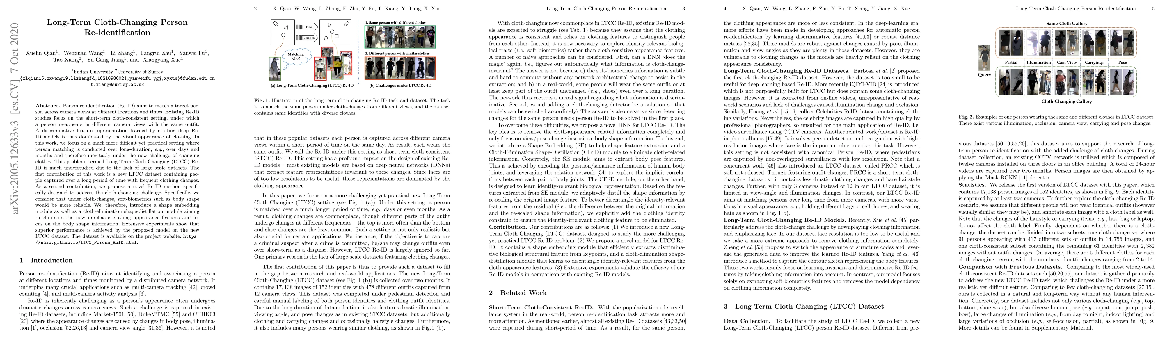 This paper introduces a new Long-Term Cloth-Changing Person Re-identification dataset and proposes a novel Re-ID method that leverages body shape features to address the challenge of frequent clothing changes over long durations. The proposed method includes a shape embedding module and a cloth-elimination shape-distillation module to focus on reliable soft-biometrics.