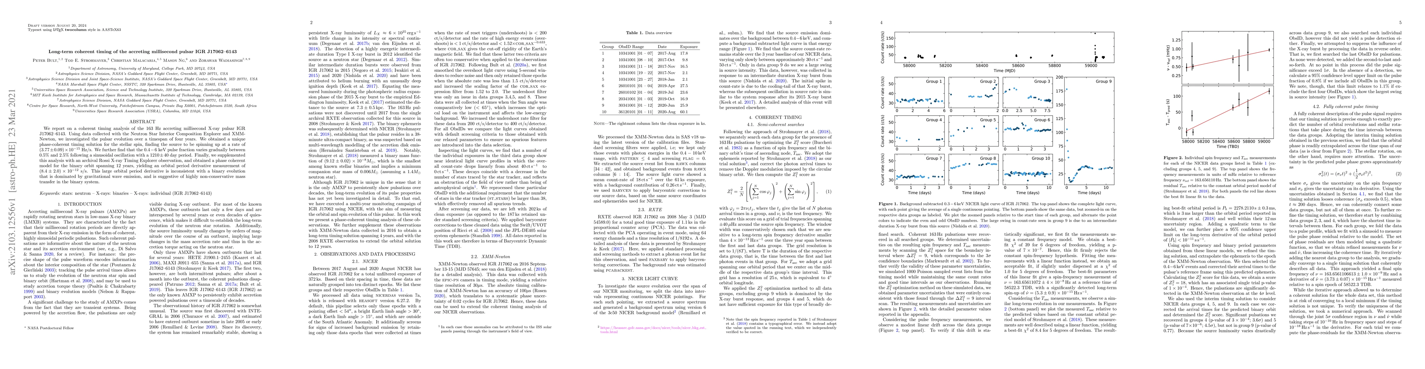 Researchers analyzed a millisecond pulsar's timing over 4 years, finding it spins up at a rate of 163 Hz/s and exhibiting sinusoidal oscillations in its pulse fraction. The large orbital period derivative suggests non-conservative mass transfer in the binary system.