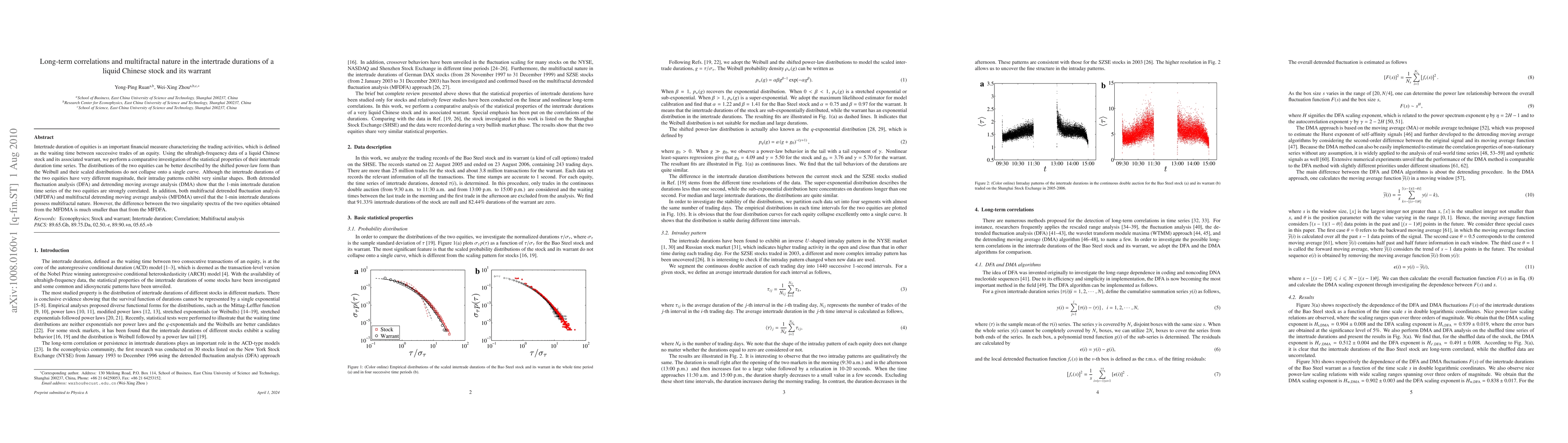 This paper investigates the statistical properties of intertrade durations in a liquid Chinese stock and its warrant, finding that their distributions follow a shifted power-law form. Both equities exhibit strong 1-min intertrade duration correlations and multifractal characteristics, though the singularity spectrum difference between them is smaller for MFDMA than MFDFA.