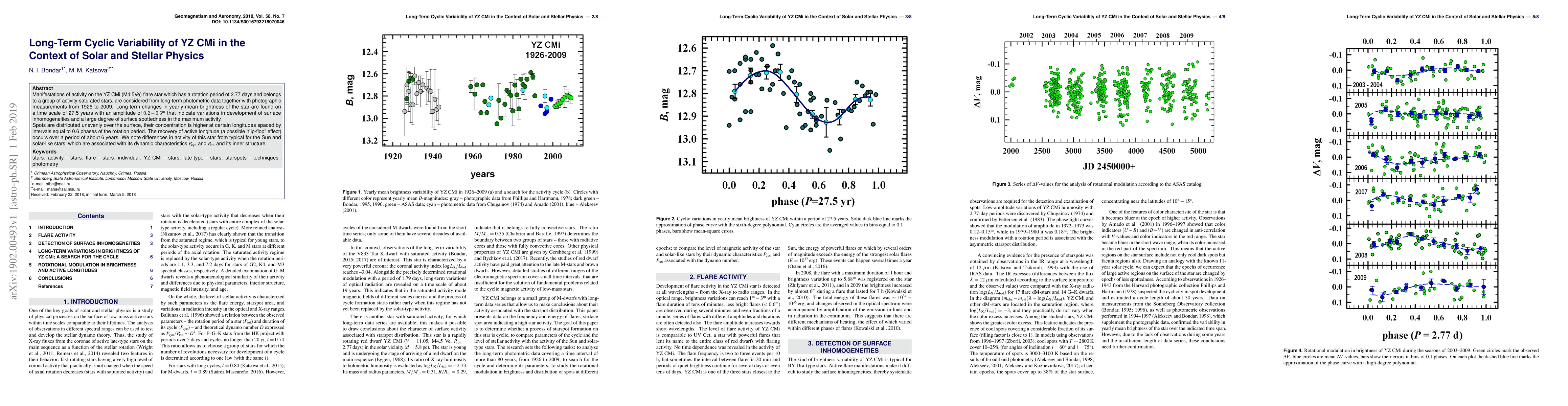 Manifestations of activity on the YZ CMi (M4.5Ve) flare star which has a rotation period of 2.77 days and belongs to a group of activity-saturated stars, are considered from long-term photometric data together with photographic measurements from 1926 to 2009. Long-term changes in yearly mean brightness of the star are found on a time scale of 27.5 years with an amplitude of $0.2 - 0.3^m$ that indicate variations in development of surface inhomogeneities and a large degree of surface spottedness in the maximum activity. Spots are distributed unevenly over the surface, their concentration is higher at certain longitudes spaced by intervals equal to 0.6 phases of the rotation period. The recovery of active longitude (a possible "flip-flop" effect) occurs over a period of about 6 years. We note differences in activity of this star from typical for the Sun and solar-like stars, which are associated with its dynamic characteristics $P_{cyc}$ and $P_{rot}$ and its inner structure.