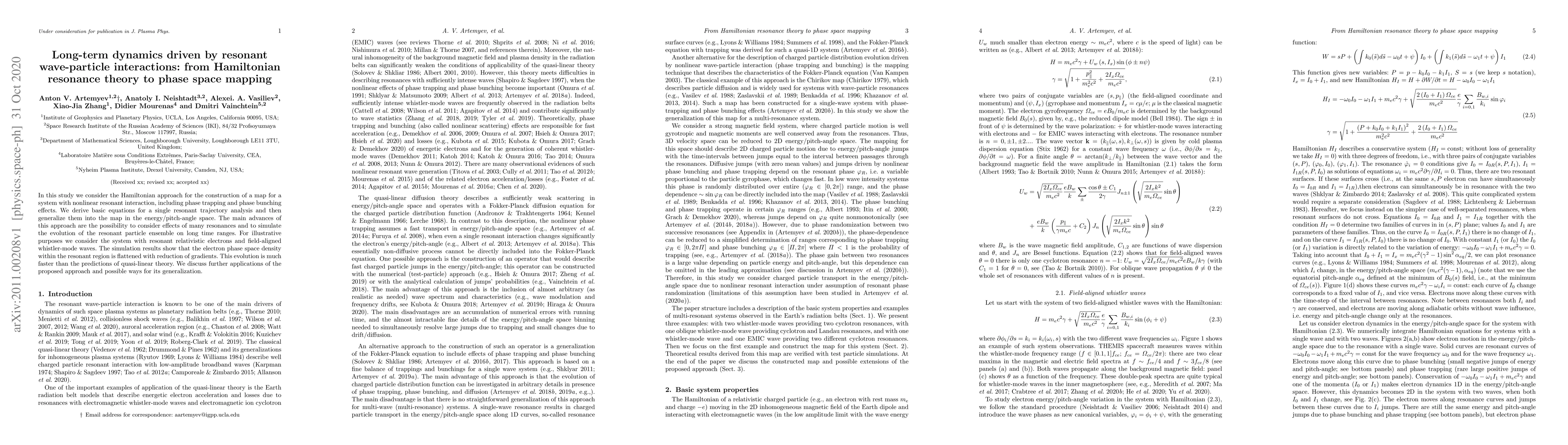 In this study we consider the Hamiltonian approach for the construction of a map for a system with nonlinear resonant interaction, including phase trapping and phase bunching effects. We derive basic equations for a single resonant trajectory analysis and then generalize them into the map in the energy/pitch-angle space. The main advances of this approach are the possibility to consider effects of many resonances and to simulate the evolution of the resonant particle ensemble on long time ranges. For illustrative purposes we consider the system with resonant relativistic electrons and field-aligned whistler-mode waves. The simulation results show that the electron phase space density within the resonant region is flattened with reduction of gradients. This evolution is much faster than the predictions of quasi-linear theory. We discuss further applications of the proposed approach and possible ways for its generalization.