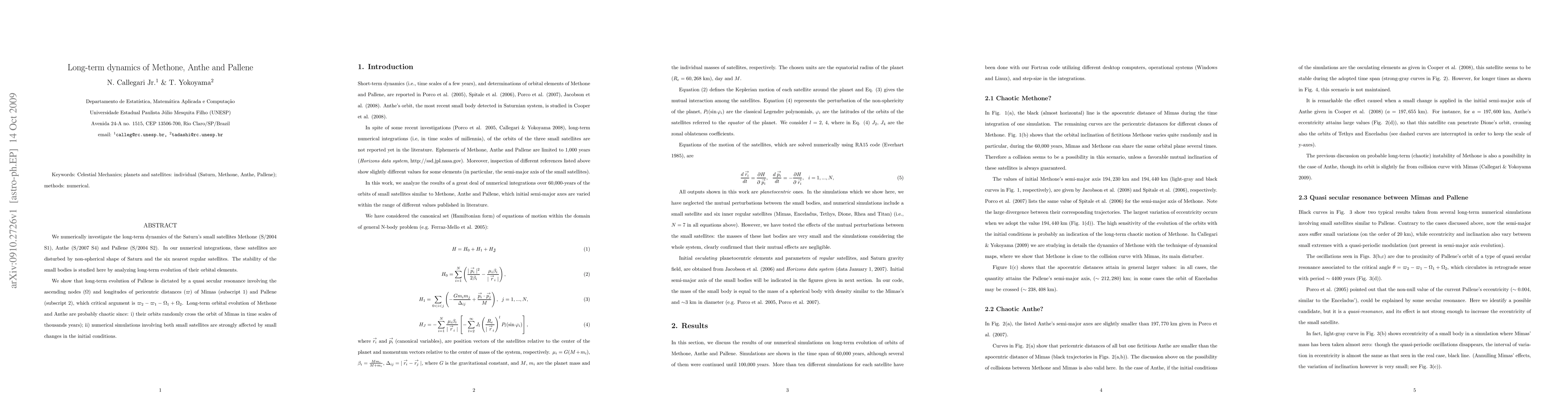 This paper investigates the long-term orbital dynamics of Saturn's small moons Methone, Anthe, and Pallene, revealing that Pallene's evolution is influenced by a quasi secular resonance, while Methone and Anthe exhibit chaotic orbital behavior due to interactions with nearby satellites.