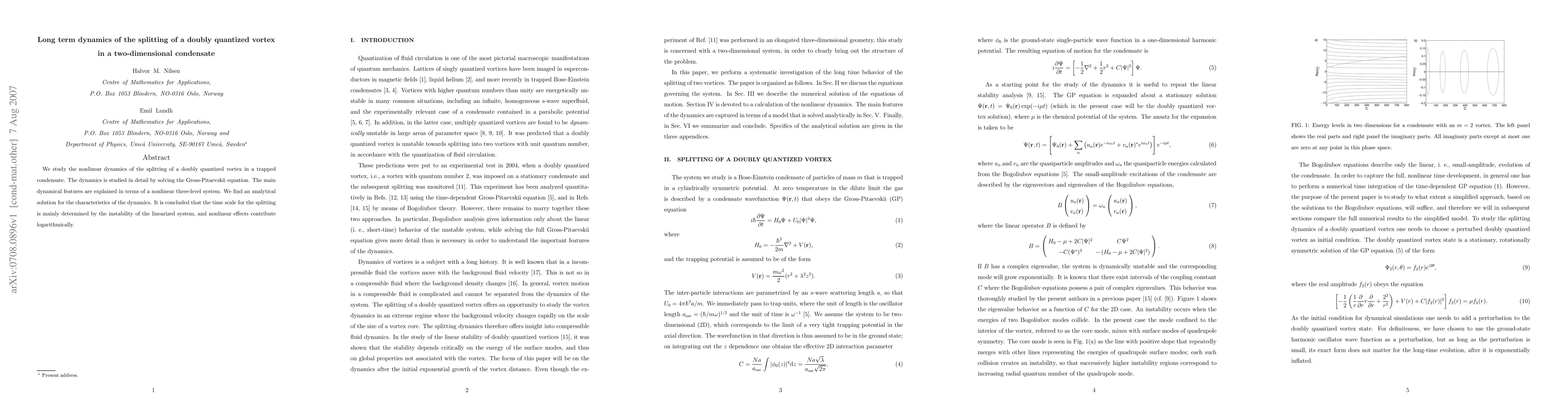 This paper investigates the nonlinear dynamics of a doubly quantized vortex splitting in a trapped two-dimensional condensate, solving the Gross-Pitaevskii equation. The study reveals that the splitting's time scale is primarily governed by the instability of the linearized system, with nonlinear effects adding logarithmically.