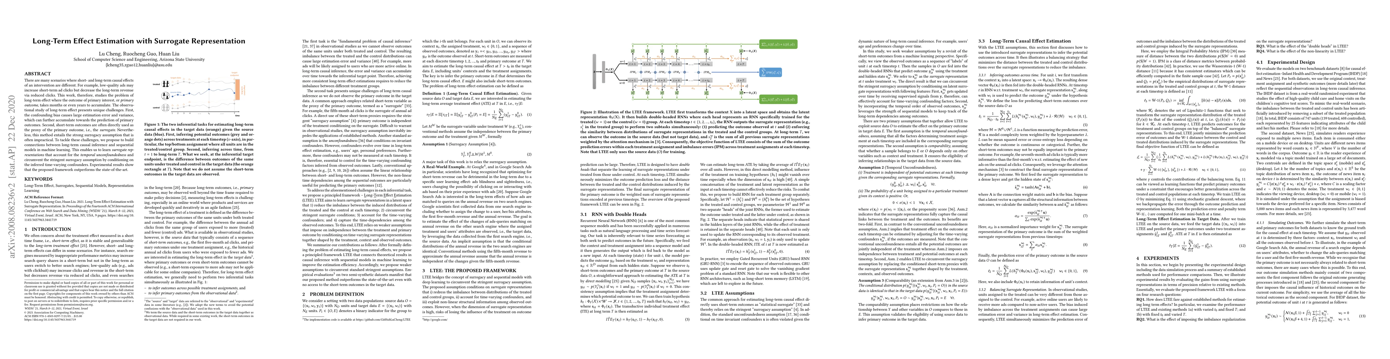 There are many scenarios where short- and long-term causal effects of an intervention are different. For example, low-quality ads may increase short-term ad clicks but decrease the long-term revenue via reduced clicks. This work, therefore, studies the problem of long-term effect where the outcome of primary interest, or primary outcome, takes months or even years to accumulate. The observational study of long-term effect presents unique challenges. First, the confounding bias causes large estimation error and variance, which can further accumulate towards the prediction of primary outcomes. Second, short-term outcomes are often directly used as the proxy of the primary outcome, i.e., the surrogate. Nevertheless, this method entails the strong surrogacy assumption that is often impractical. To tackle these challenges, we propose to build connections between long-term causal inference and sequential models in machine learning. This enables us to learn surrogate representations that account for the temporal unconfoundedness and circumvent the stringent surrogacy assumption by conditioning on the inferred time-varying confounders. Experimental results show that the proposed framework outperforms the state-of-the-art.