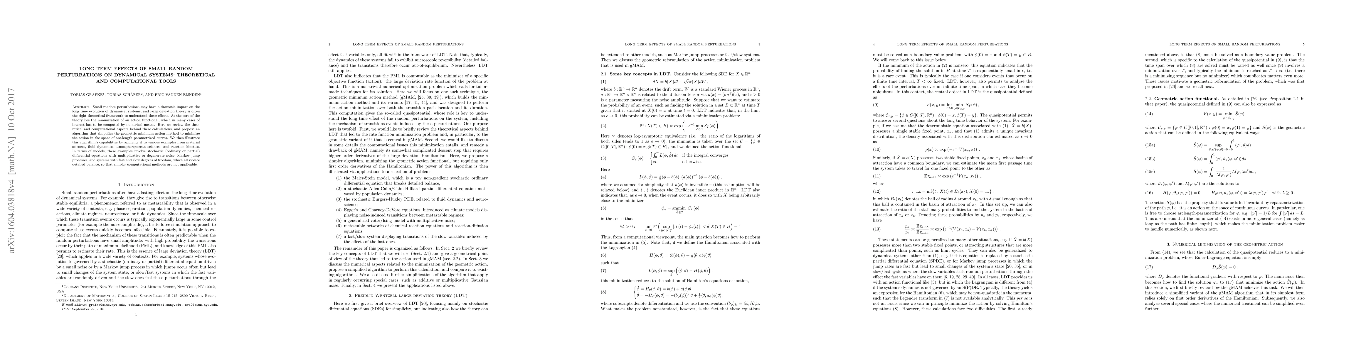 Small random perturbations may have a dramatic impact on the long time evolution of dynamical systems, and large deviation theory is often the right theoretical framework to understand these effects. At the core of the theory lies the minimization of an action functional, which in many cases of interest has to be computed by numerical means. Here we review the theoretical and computational aspects behind these calculations, and propose an algorithm that simplifies the geometric minimum action method to minimize the action in the space of arc-length parametrized curves. We then illustrate this algorithm's capabilities by applying it to various examples from material sciences, fluid dynamics, atmosphere/ocean sciences, and reaction kinetics. In terms of models, these examples involve stochastic (ordinary or partial) differential equations with multiplicative or degenerate noise, Markov jump processes, and systems with fast and slow degrees of freedom, which all violate detailed balance, so that simpler computational methods are not applicable.