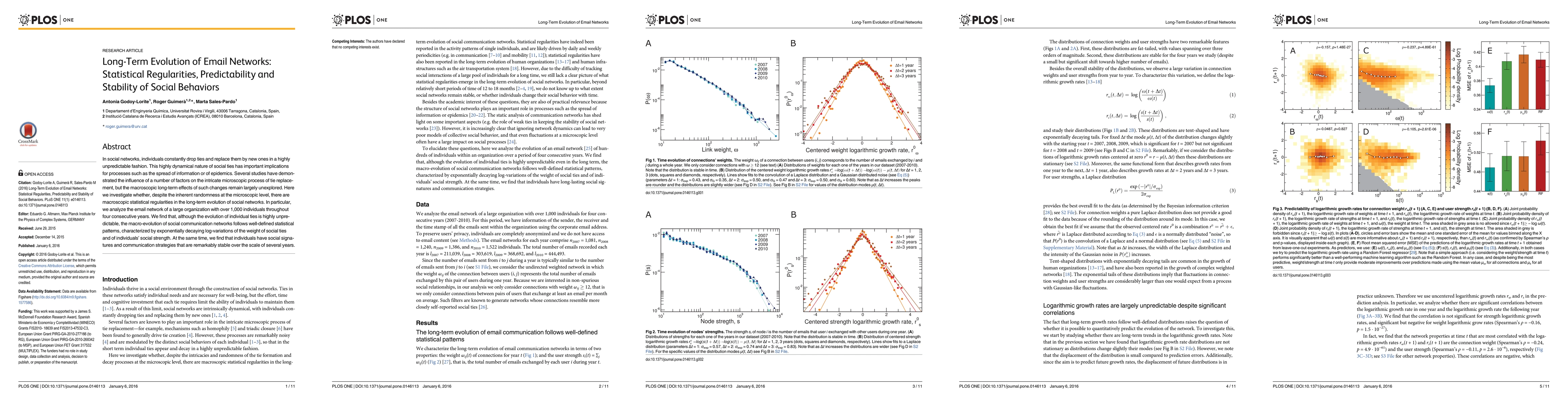 In social networks, individuals constantly drop ties and replace them by new ones in a highly unpredictable fashion. This highly dynamical nature of social ties has important implications for processes such as the spread of information or of epidemics. Several studies have demonstrated the influence of a number of factors on the intricate microscopic process of tie replacement, but the macroscopic long-term effects of such changes remain largely unexplored. Here we investigate whether, despite the inherent randomness at the microscopic level, there are macroscopic statistical regularities in the long-term evolution of social networks. In particular, we analyze the email network of a large organization with over 1,000 individuals throughout four consecutive years. We find that, although the evolution of individual ties is highly unpredictable, the macro-evolution of social communication networks follows well-defined statistical patterns, characterized by exponentially decaying log-variations of the weight of social ties and of individuals' social strength. At the same time, we find that individuals have social signatures and communication strategies that are remarkably stable over the scale of several years.