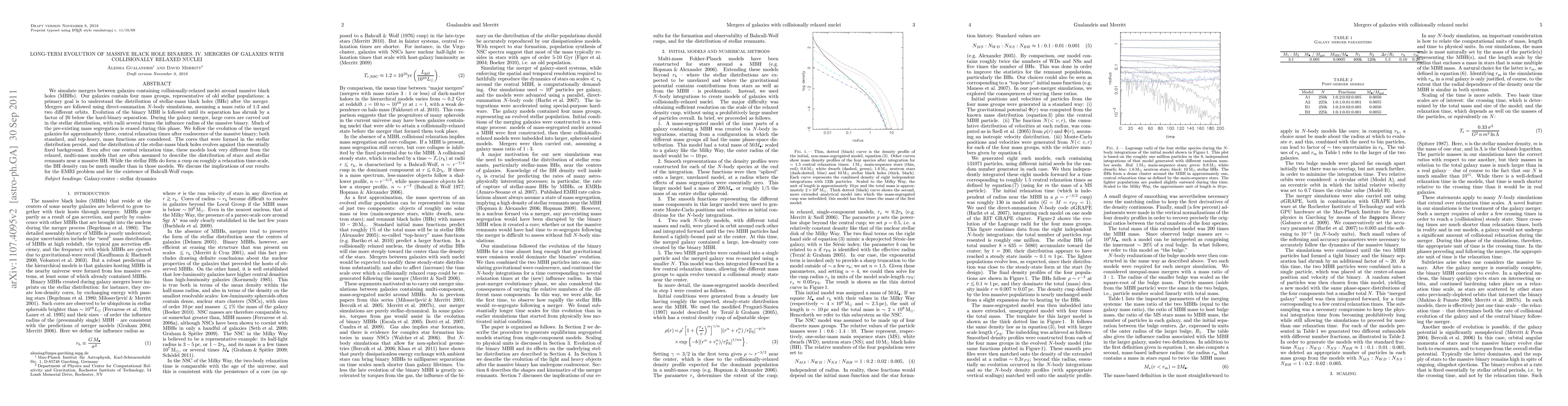 This paper simulates galaxy mergers featuring collisionally-relaxed nuclei around massive black holes, focusing on the evolution of stellar-mass black holes post-merger. The study finds that the distribution of stellar-mass black holes differs significantly from typical relaxed models, with implications for extreme mass ratio inspirals and the existence of Bahcall-Wolf cusps.