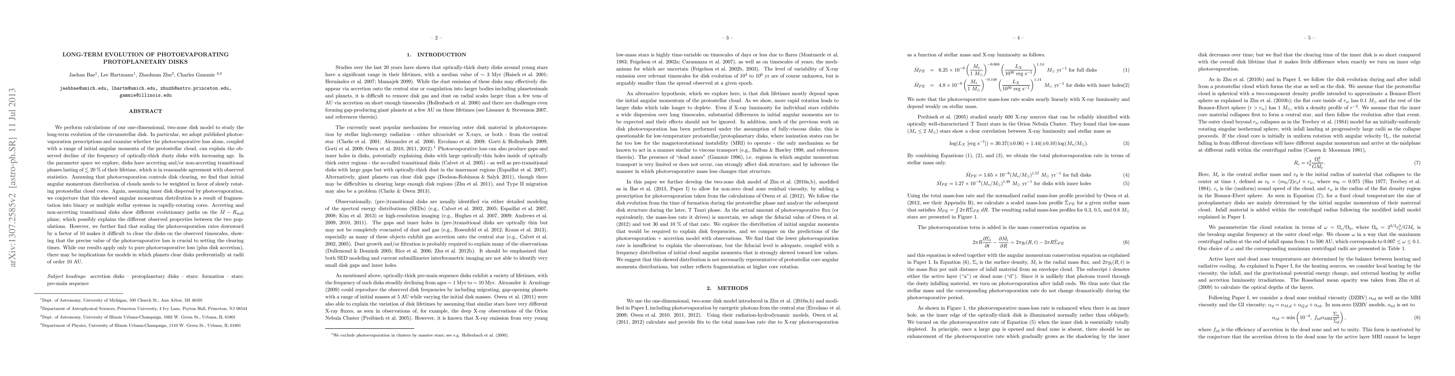 This paper investigates the long-term evolution of protoplanetary disks driven by photoevaporation, finding that the initial angular momentum of protostellar clouds influences disk clearing. The study suggests that photoevaporation alone can explain the decline in dusty disk frequency with age, but precise photoevaporation rates are crucial for disk clearing on observed timescales.