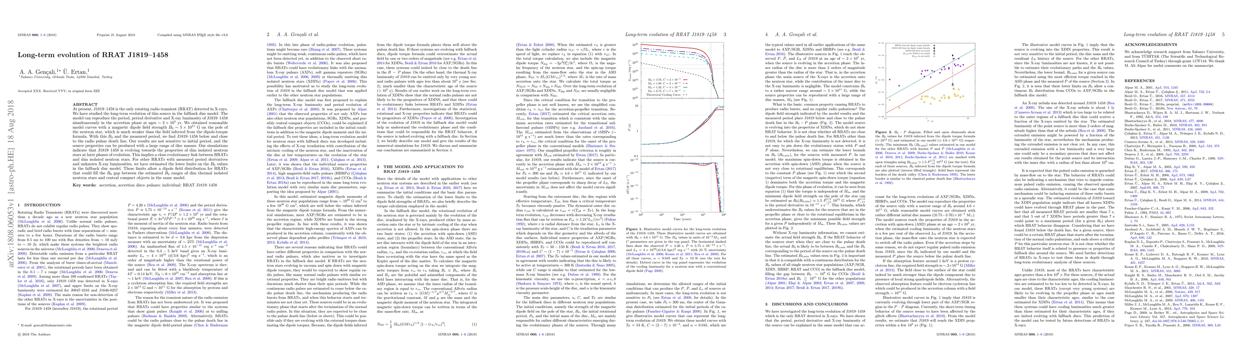 At present, J1819-1458 is the only rotating radio transient (RRAT) detected in X-rays. We have studied the long-term evolution of this source in the fallback disc model. The model can reproduce the period, period derivative and X-ray luminosity of J1819-1458 simultaneously in the accretion phase at ages $\sim 2 \times 10^5$ yr. We obtained reasonable model curves with a magnetic dipole field strength $B_0 \sim 5 \times 10^{11}$ G on the pole of the neutron star, which is much weaker than the field inferred from the dipole-torque formula. With this $B_0$ and the measured period, we find J1819-1458 below and close to the radio pulsar death line. Our results are not sensitive to initial period, and the source properties can be produced with a large range of disc masses. Our simulations indicate that J1819-1458 is evolving towards the properties of dim isolated neutron stars at later phases of evolution. This implies a close evolutionary link between RRATs and dim isolated neutron stars. For other RRATs with measured period derivatives and unknown X-ray luminosities, we have estimated the lower limits on the $B_0$ values in the fallback disc model. These limits allow a dipole field distribution for RRATs that could fill the $B_0$ gap between the estimated $B_0$ ranges of dim thermal isolated neutron stars and central compact objects in the same model.