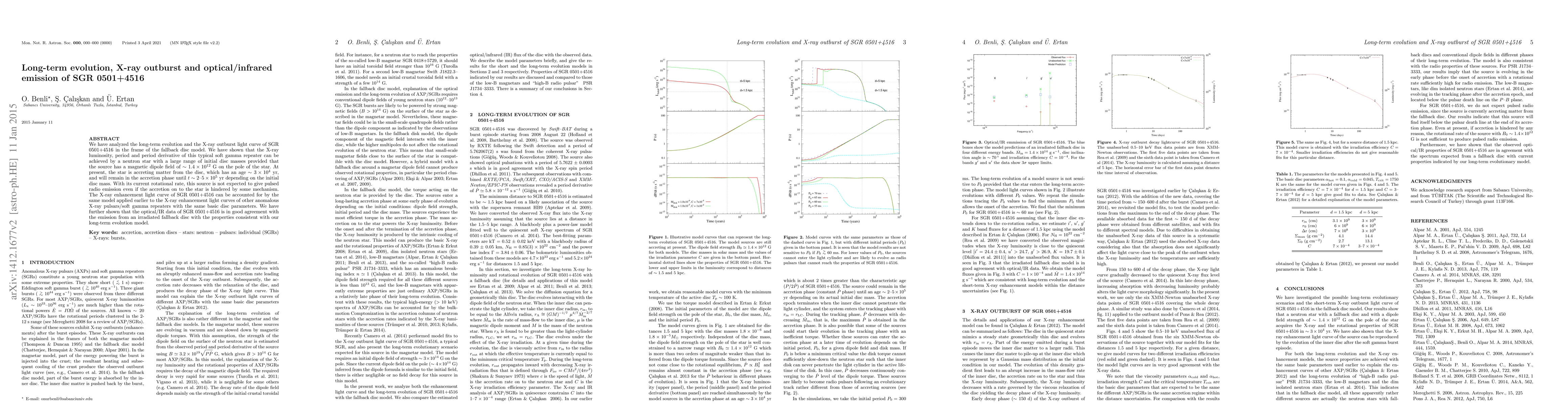 We have analyzed the long-term evolution and the X-ray outburst light curve of SGR 0501+4516 in the frame of the fallback disc model. We have shown that the X-ray luminosity, period and period derivative of this typical soft gamma repeater can be achieved by a neutron star with a large range of initial disc masses provided that the source has a magnetic dipole field of ~ 1.4 x 10^{12} G on the pole of the star. At present, the star is accreting matter from the disc, which has an age ~ 3 x 10^4 yr, and will remain in the accretion phase until t ~ 2 - 5 x 10^5 yr depending on the initial disc mass. With its current rotational rate, this source is not expected to give pulsed radio emission even if the accretion on to the star is hindered by some mechanism. The X-ray enhancement light curve of SGR 0501+4516 can be accounted for by the same model applied earlier to the X-ray enhancement light curves of other anomalous X-ray pulsars/soft gamma repeaters with the same basic disc parameters. We have further shown that the optical/IR data of SGR 0501+4516 is in good agreement with the emission from an irradiated fallback disc with the properties consistent with our long-term evolution model.