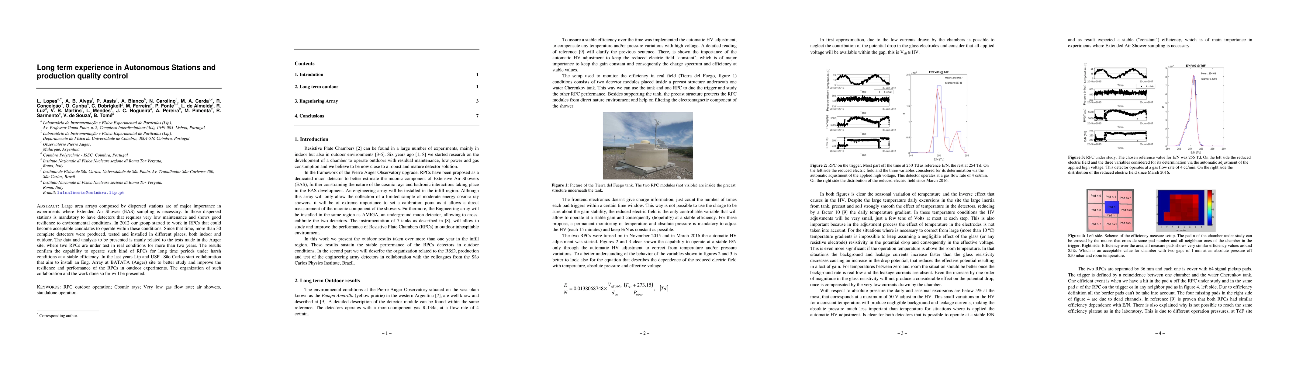 Large area arrays composed by dispersed stations are of major importance in experiments where Extended Air Shower (EAS) sampling is necessary. In those dispersed stations is mandatory to have detectors that requires very low maintenance and shows good resilience to environmental conditions. In 2012 our group started to work in RPCs that could become acceptable candidates to operate within these conditions. Since that time, more than 30 complete detectors were produced, tested and installed in different places, both indoor and outdoor. The data and analysis to be presented is manly related to the tests made in the Auger site, where two RPCs are under test in real conditions for more than two years. The results confirm the capability to operate such kind of RPCs for long time periods under harsh conditions at a stable efficiency. In the last years Lip and USP - S\~ao Carlos start collaboration that aim to install an Eng. Array at BATATA (Auger) site to better study and improve the resilience and performance of the RPCs in outdoor experiments. The organization of such collaboration and the work done so far will be presented.