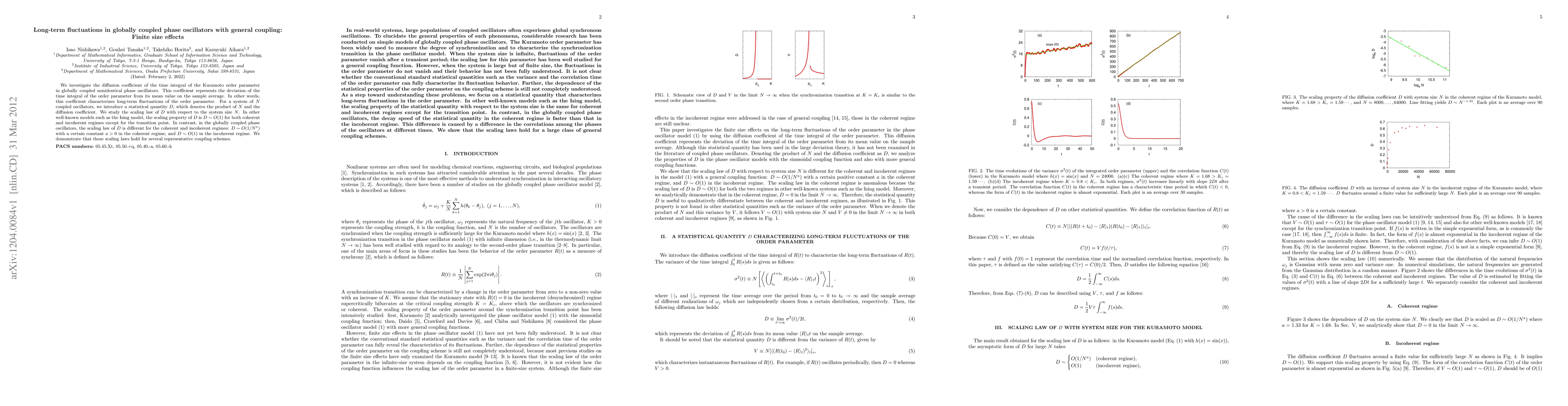 This paper explores the long-term fluctuations in globally coupled phase oscillators, focusing on the diffusion coefficient of the Kuramoto order parameter's time integral. It finds that the scaling law for this coefficient differs between coherent and incoherent regimes, with D scaling as O(1/N^a) in the coherent regime and O(1) in the incoherent regime, contrasting with similar models like the Ising model.
