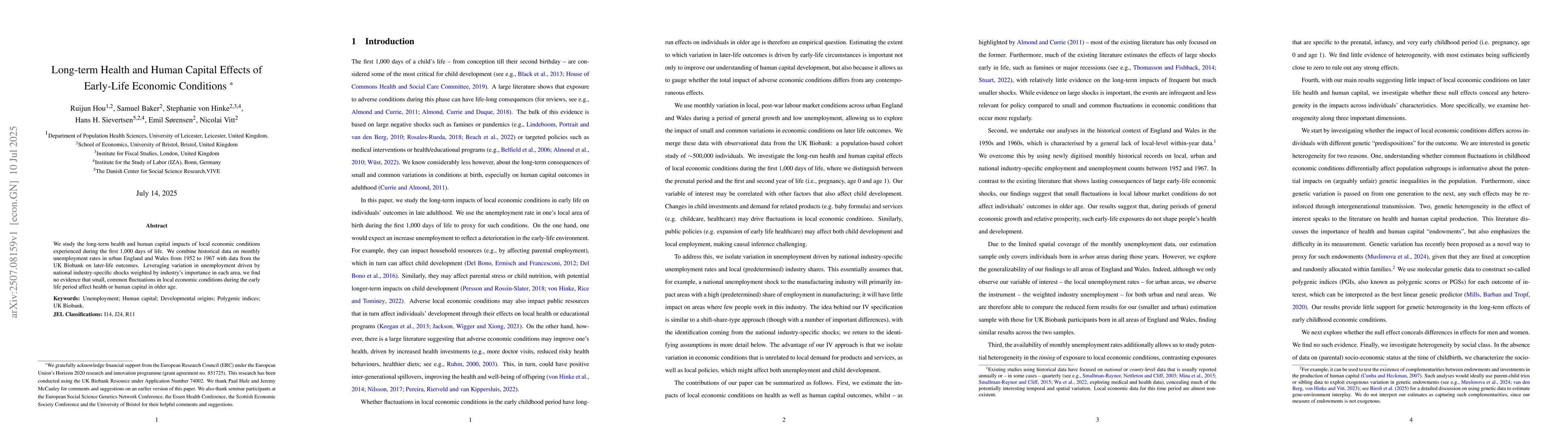 We study the long-term health and human capital impacts of local economic conditions experienced during the first 1,000 days of life. We combine historical data on monthly unemployment rates in urban England and Wales 1952-1967 with data from the UK Biobank on later-life outcomes. Leveraging variation in unemployment driven by national industry-specific shocks weighted by industry's importance in each area, we find no evidence that small, common fluctuations in local economic conditions during the early life period affect health or human capital in older age.